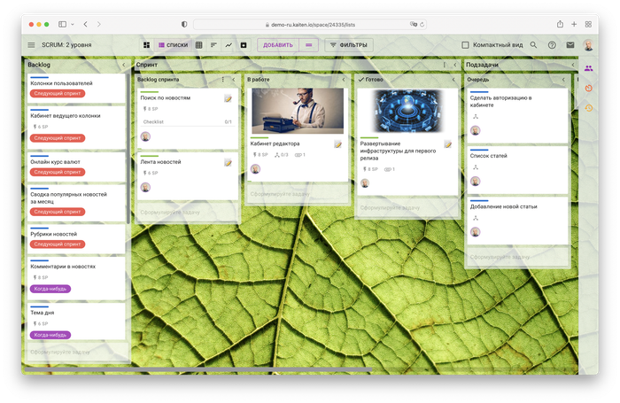 - создавать канбан-доски с возможностью адаптации пространства под свои потребности;