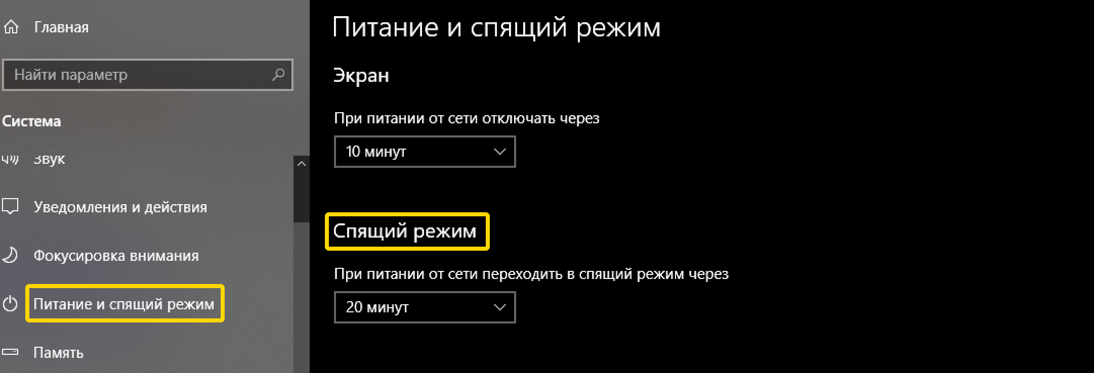 - WIN + I для открытия параметров. Затем перейти в раздел "Система", а от туда перейти в "Питание" и "Спящий режим"