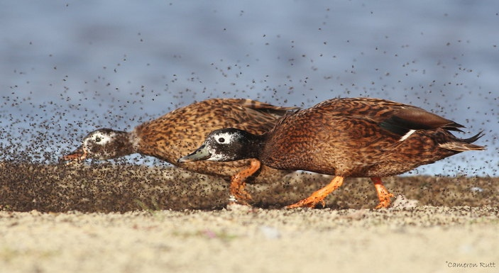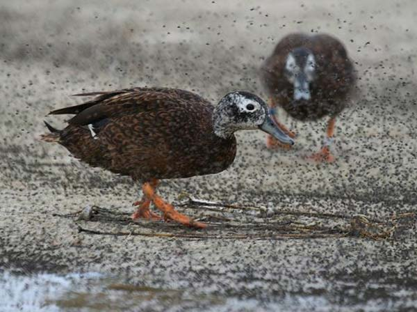 Лайсанский чирок: Забегает в тучу мух, хлопает пастью как крокодил и уходит сытый. Странный способ «охоты» крохотной уточки с Гавайев
