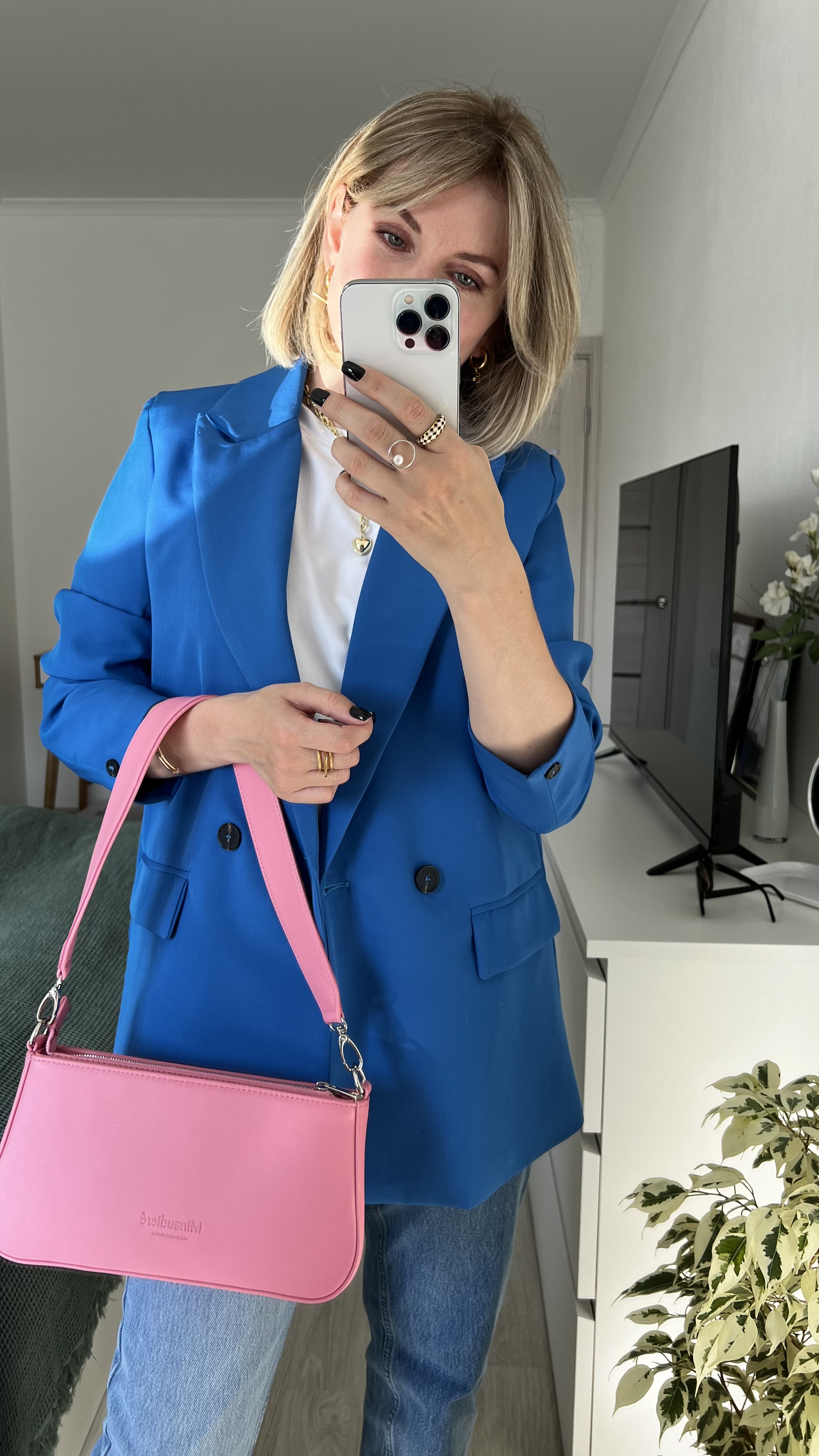 Я люблю разбавлять такие образы цветом, розовая сумка на мой взгляд добавляет свежести и яркости.