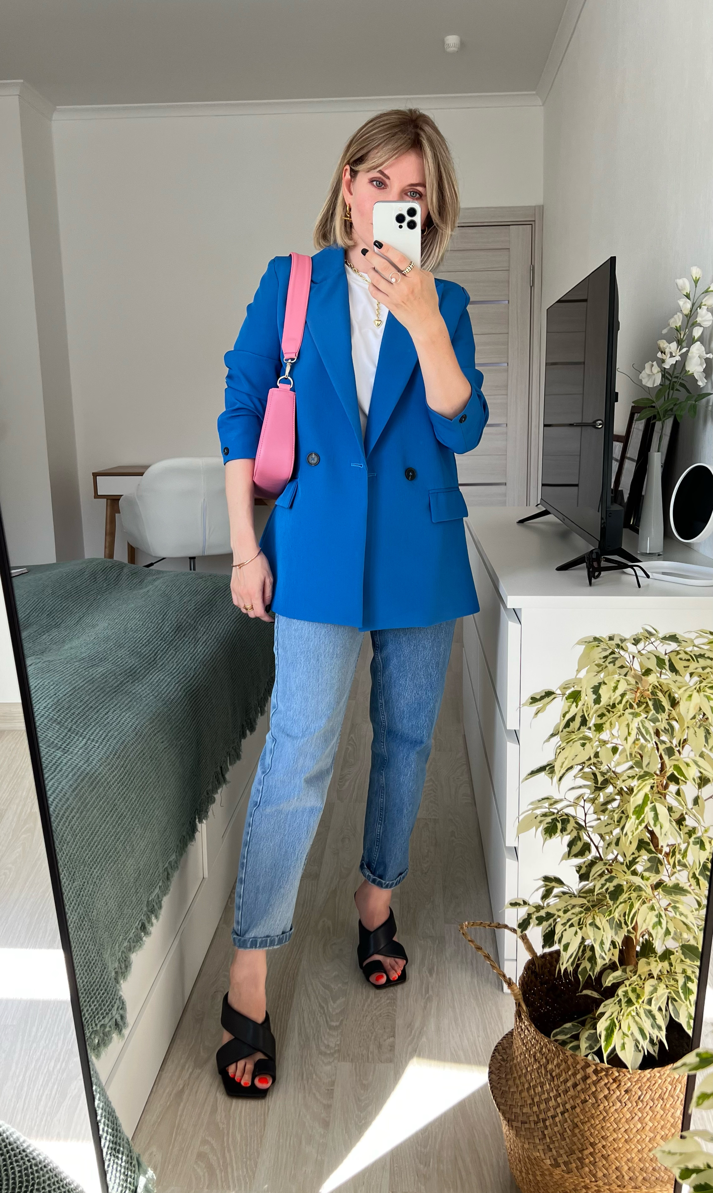 Сочетание: жакет, футболка и джинсы уже современная классика.