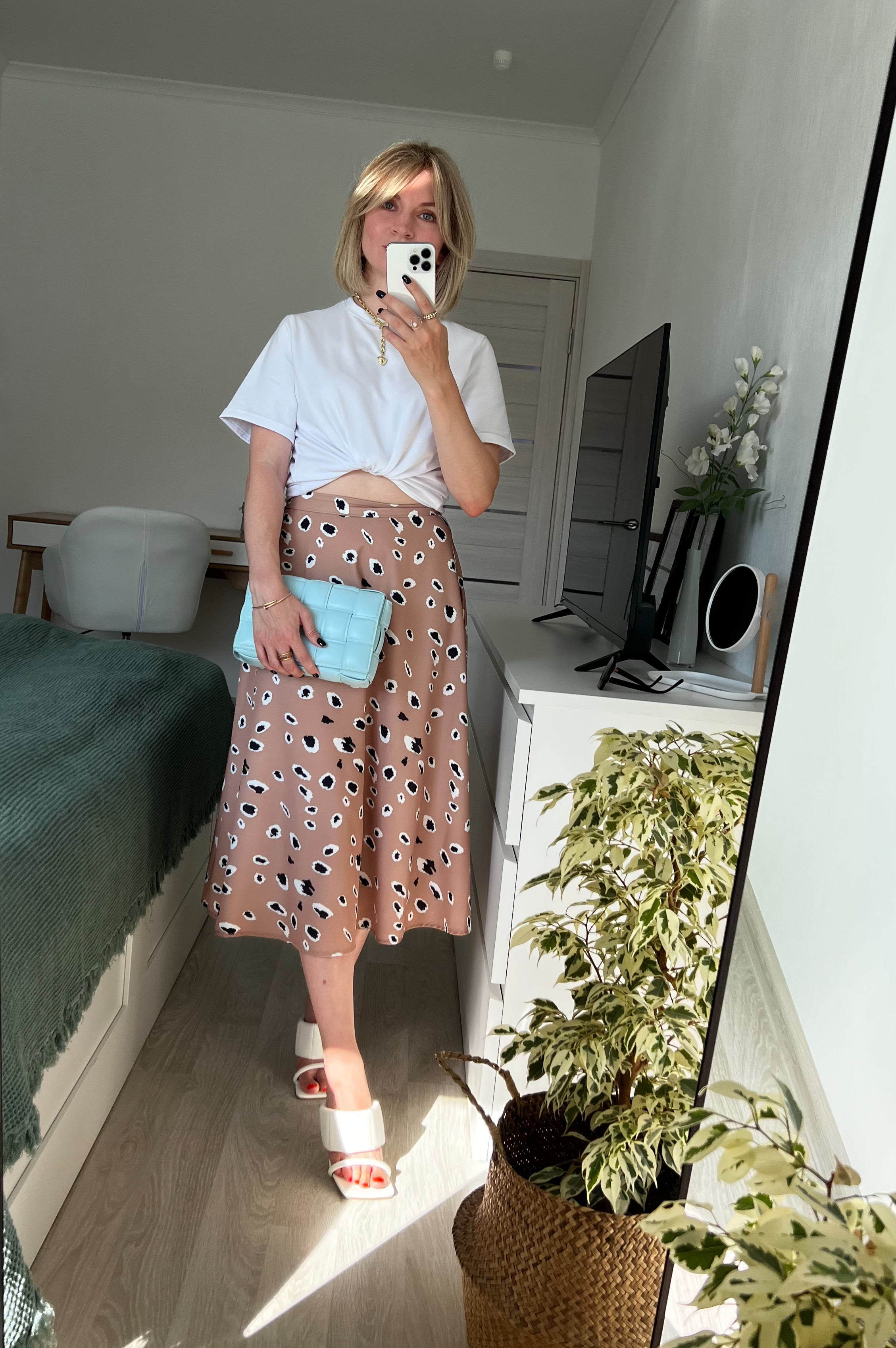 Тут снова принцип микса. Кстати, футболку необязательно заправлять, можно скрутить края и подвернуть, как это сделать показала в ролике.