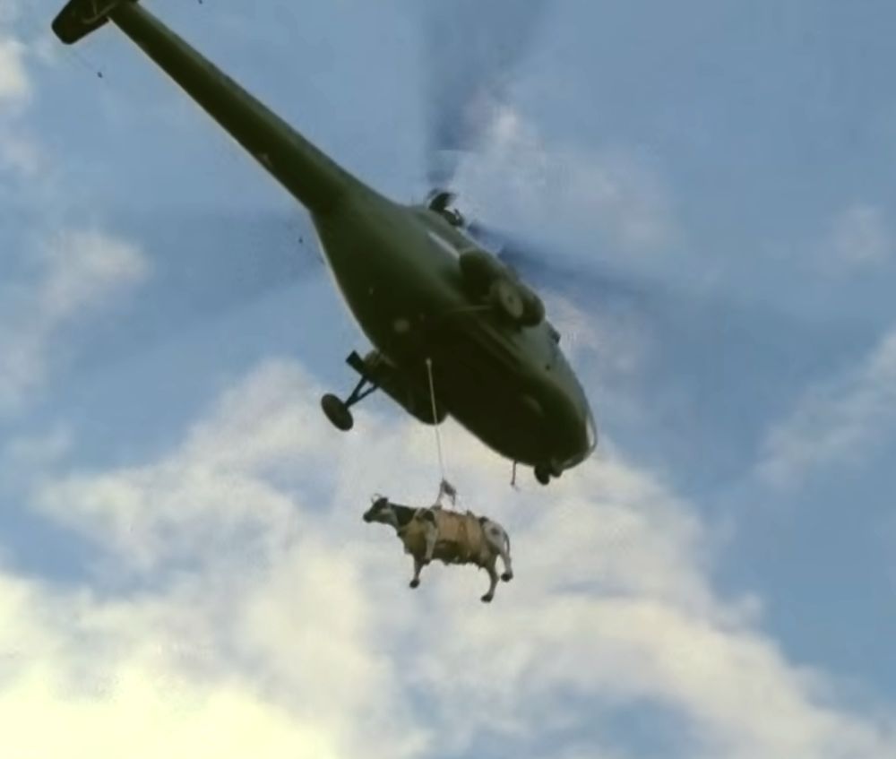 В принципе, всё верно. В наши дни час аренды подобной техники меньше чем за 100000 рублей не найти. А уж увезти корову таким образом вряд ли дешевле 200-300 тысяч рублей получится. Если вообще кто-то на такую авантюру согласится.