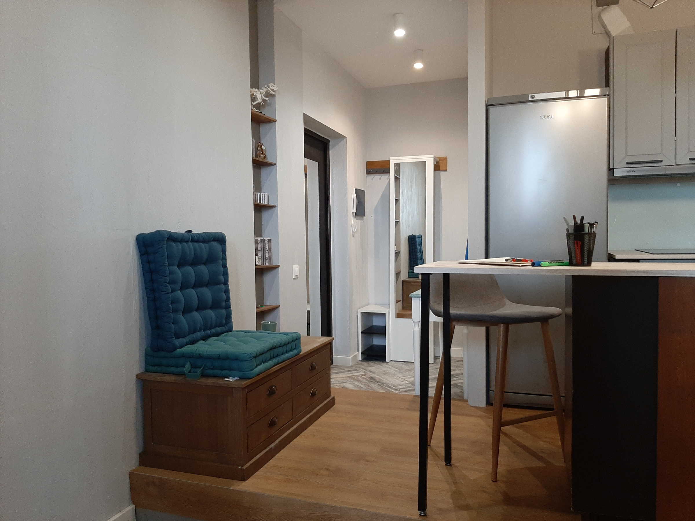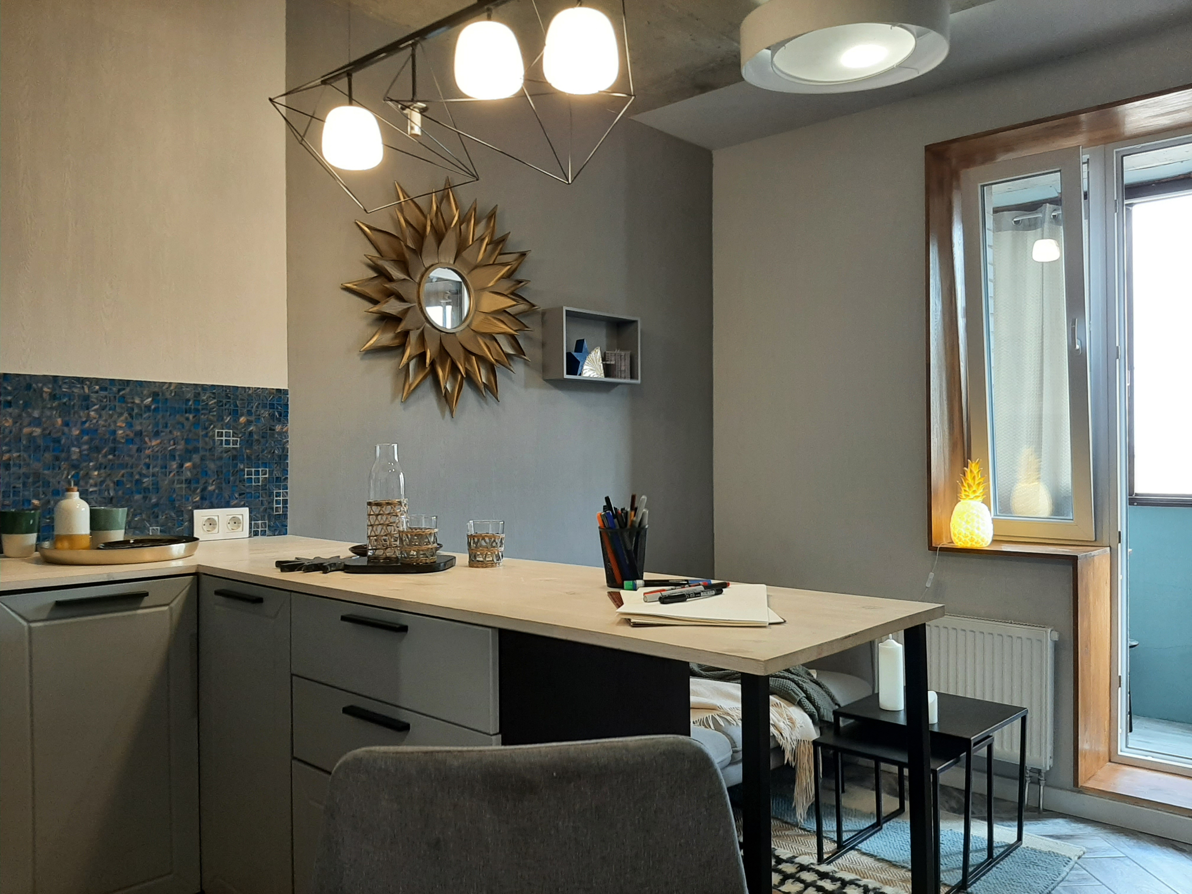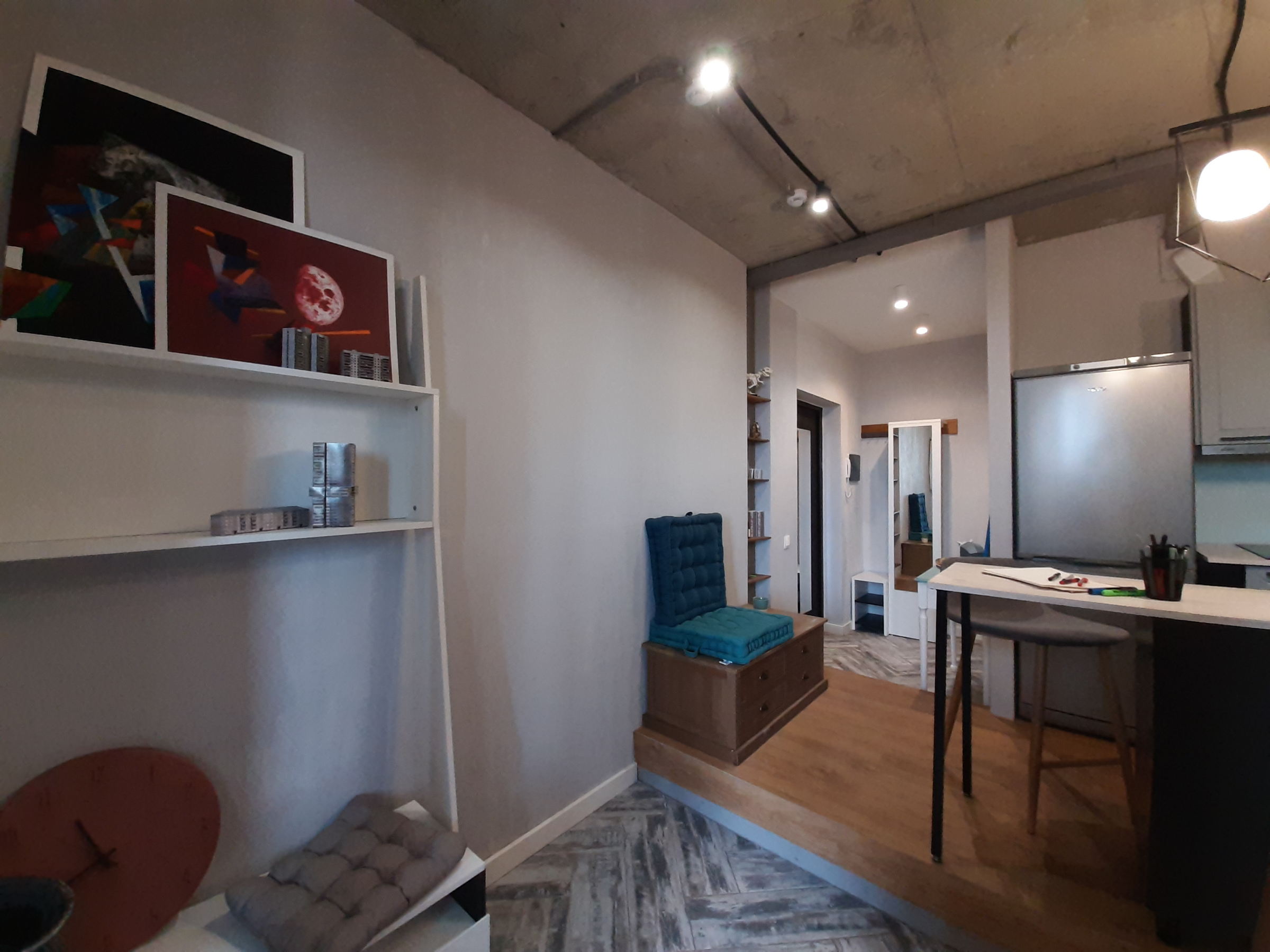Эта студия предназначена для аренды и в самом начале я допустил ошибку, а именно решил сделать нейтральный интерьер. Не хотел вводить в небольшое пространство цвет, поскольку он может кому-то нравиться, а кого-то оттолкнет. Поэтому интерьер и обстановку выдержал в нейтральных серых оттенках.