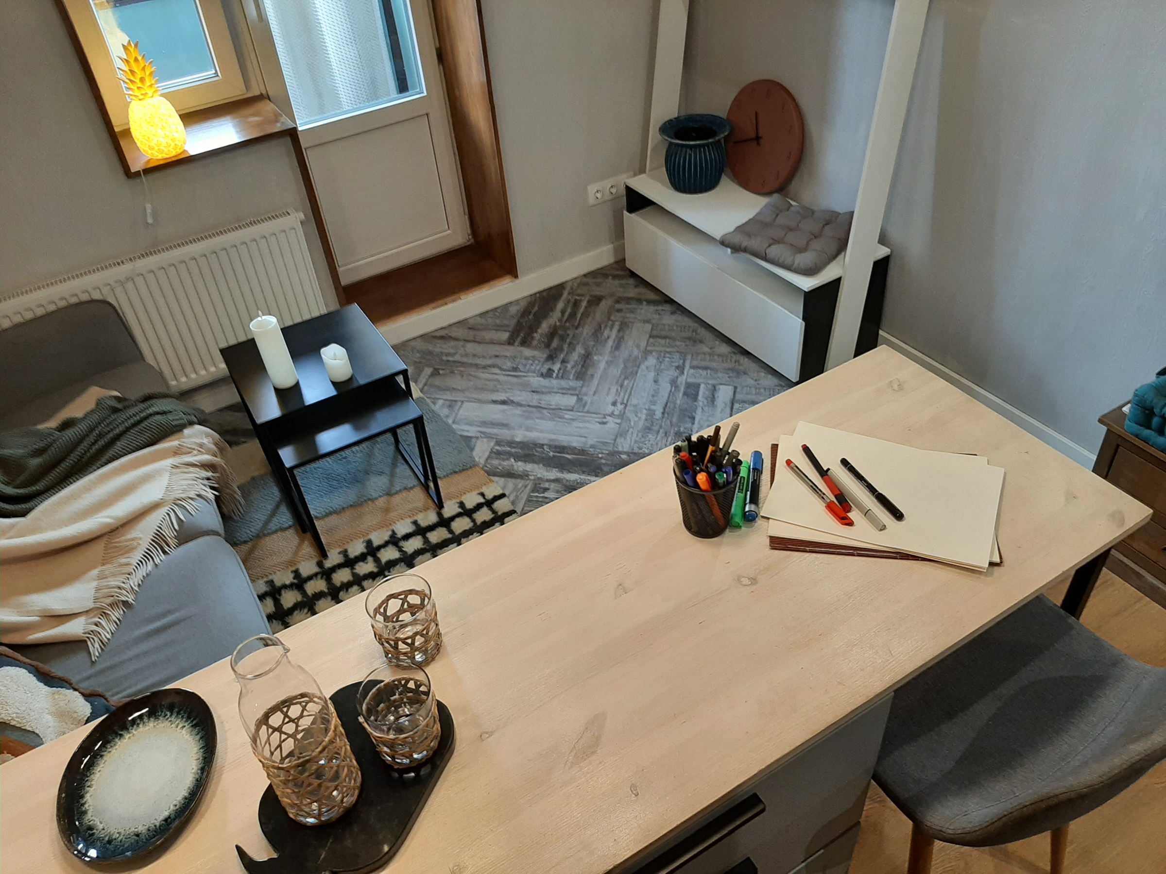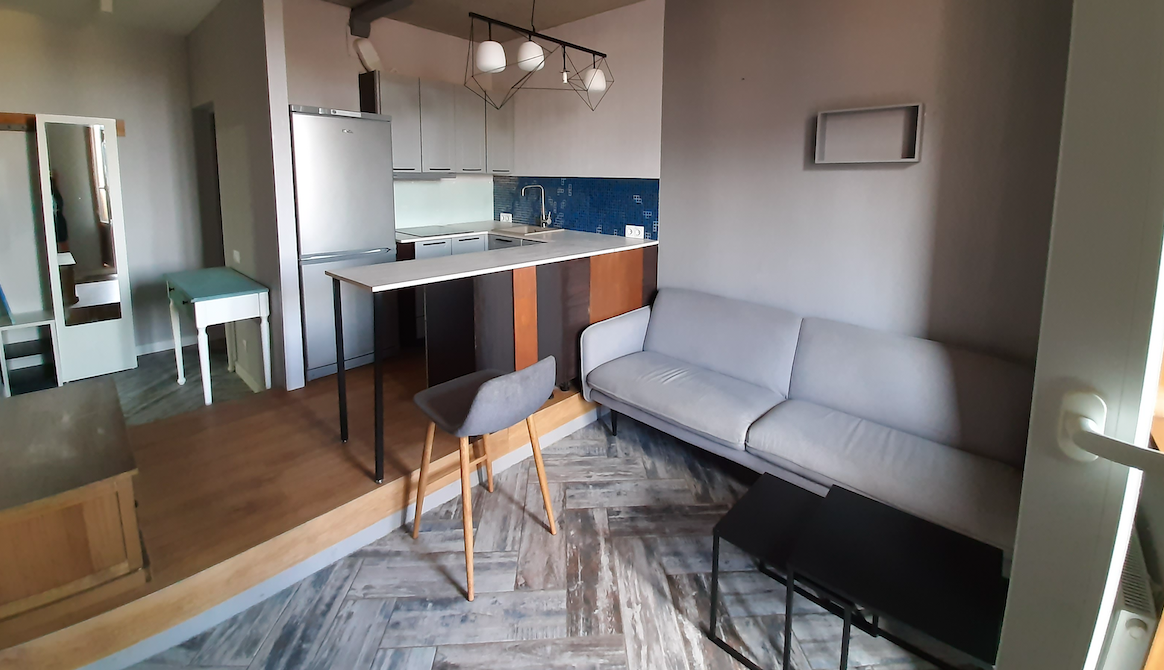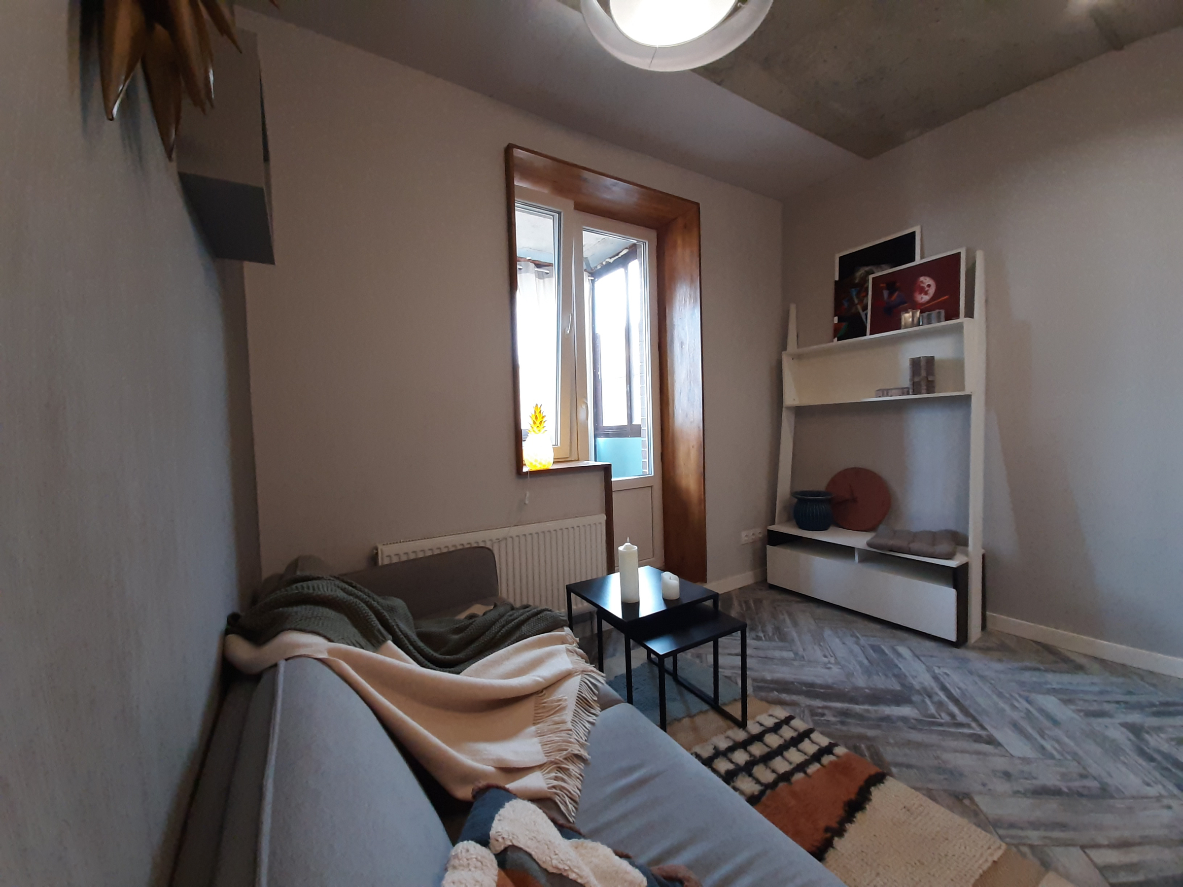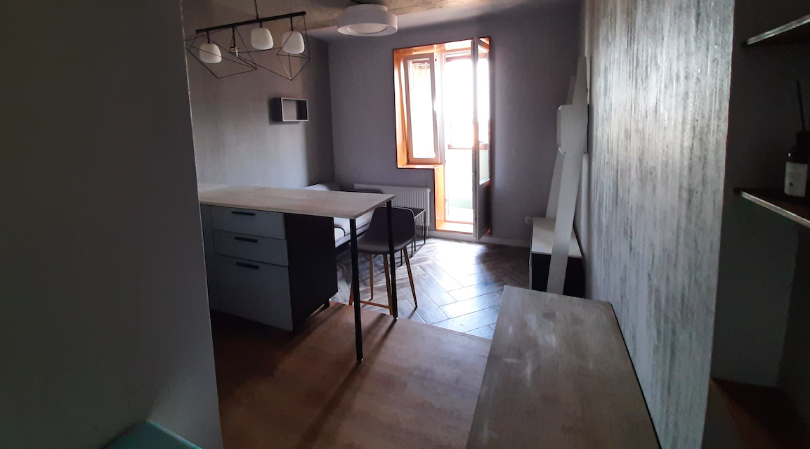 Эта студия предназначена для аренды и в самом начале я допустил ошибку, а именно решил сделать нейтральный интерьер. Не хотел вводить в небольшое пространство цвет, поскольку он может кому-то нравиться, а кого-то оттолкнет. Поэтому интерьер и обстановку выдержал в нейтральных серых оттенках.