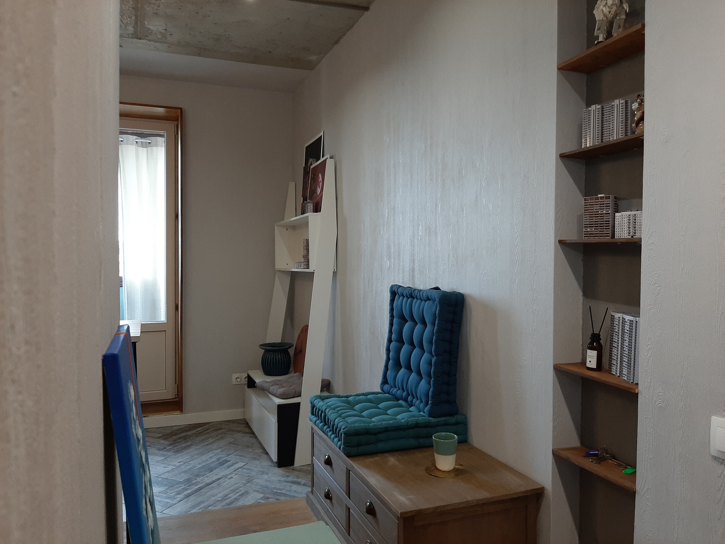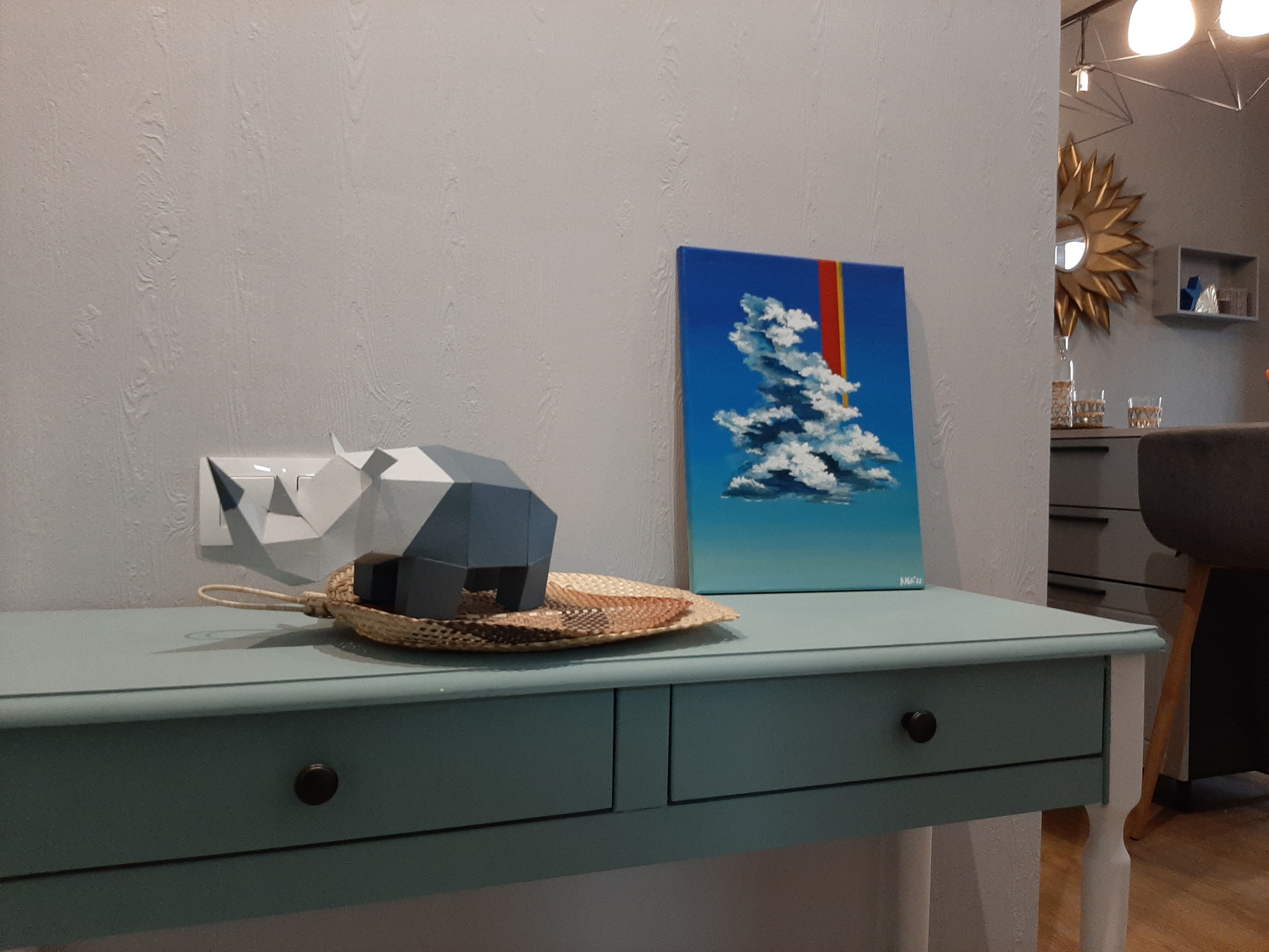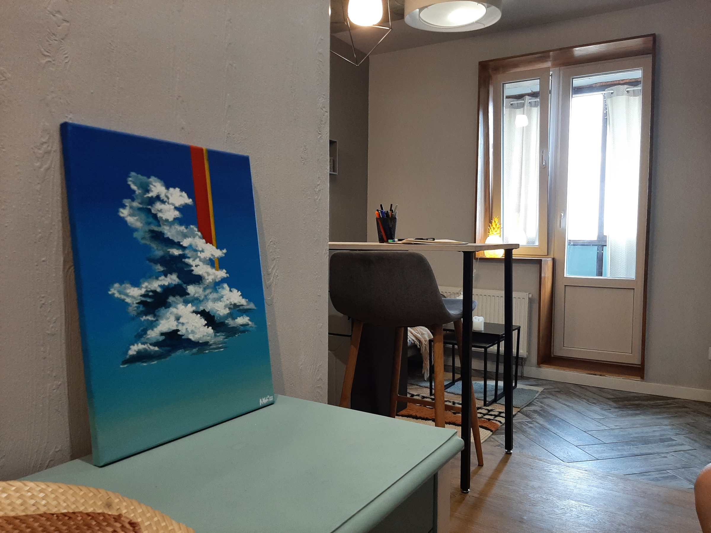 Из моей коллекции картин Лена выбрала две абстракции и интерьер заиграл новыми красками — теперь это не серая студия, а уютная квартира в которой хочется остаться жить.