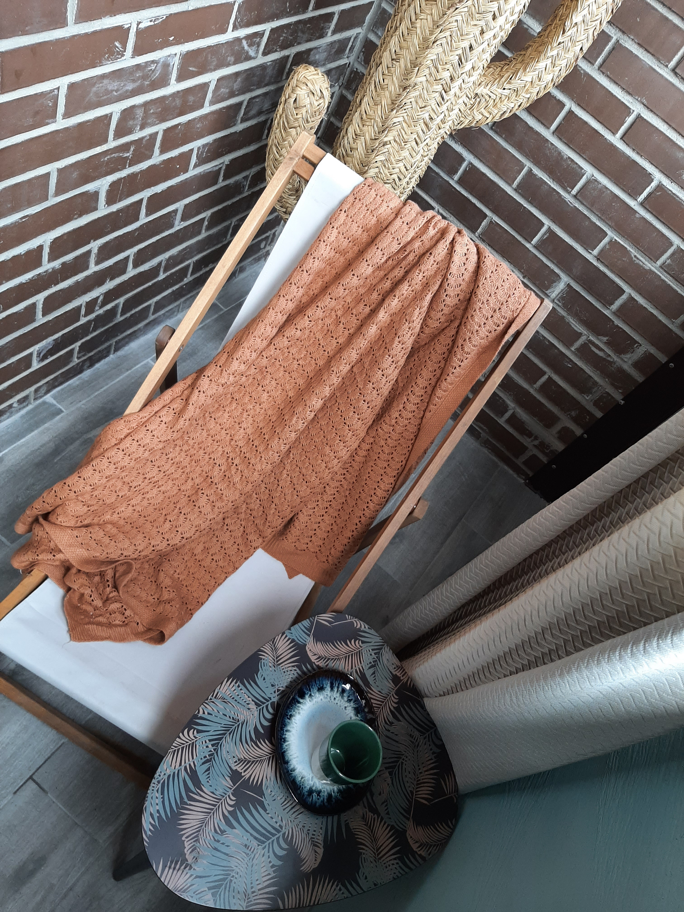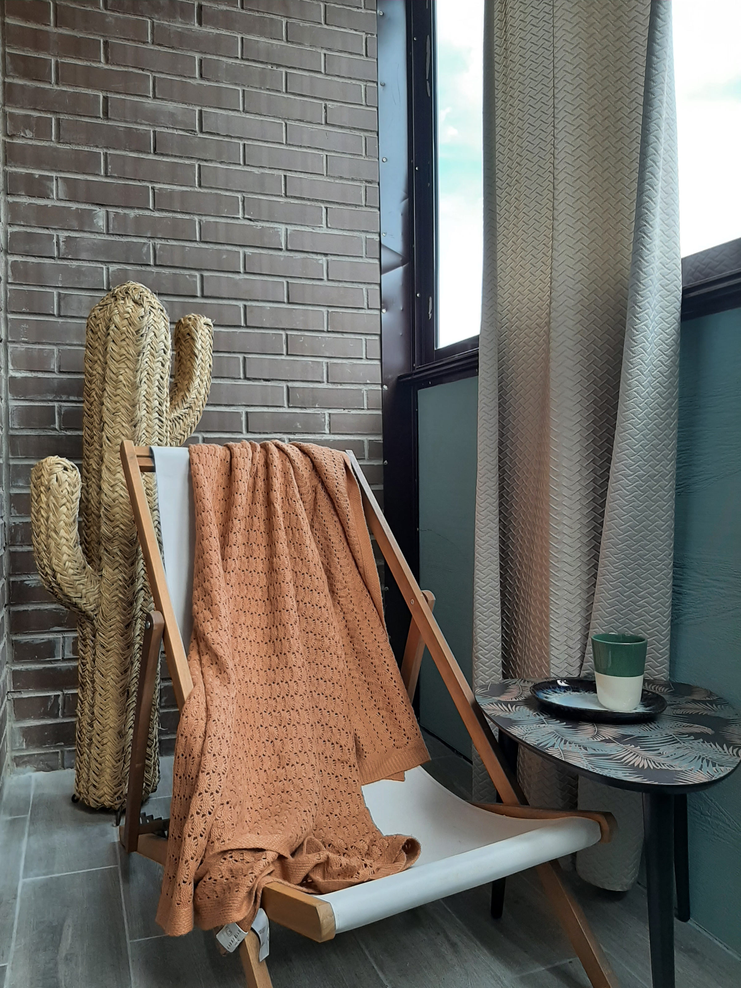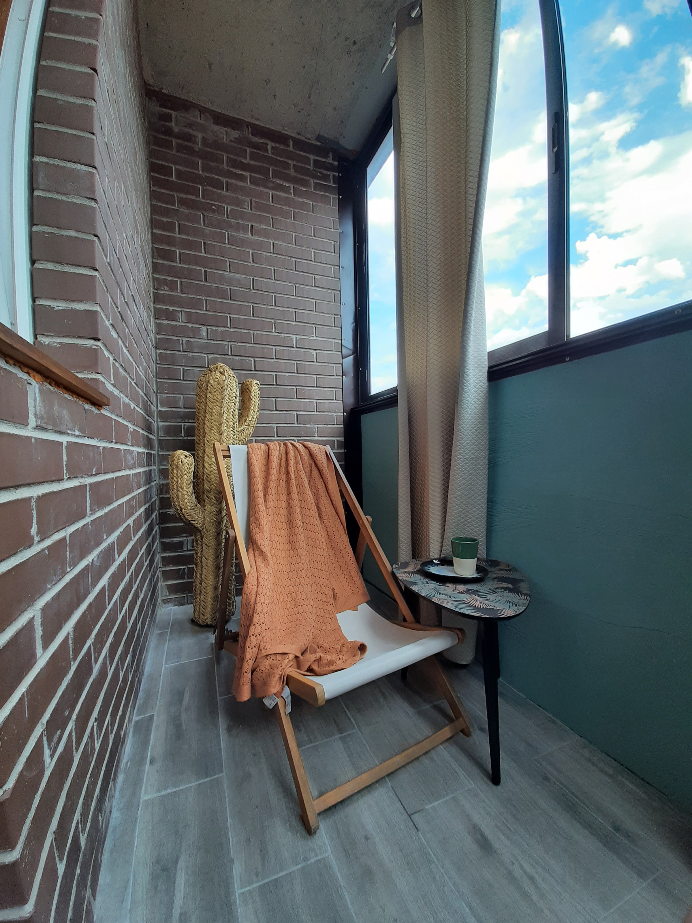 Особенная гордость — это зона отдыха на балконе, для ее обустройства потребовался шезлонг Amezza из акации, плед и кофейный столик с ярким принтом.