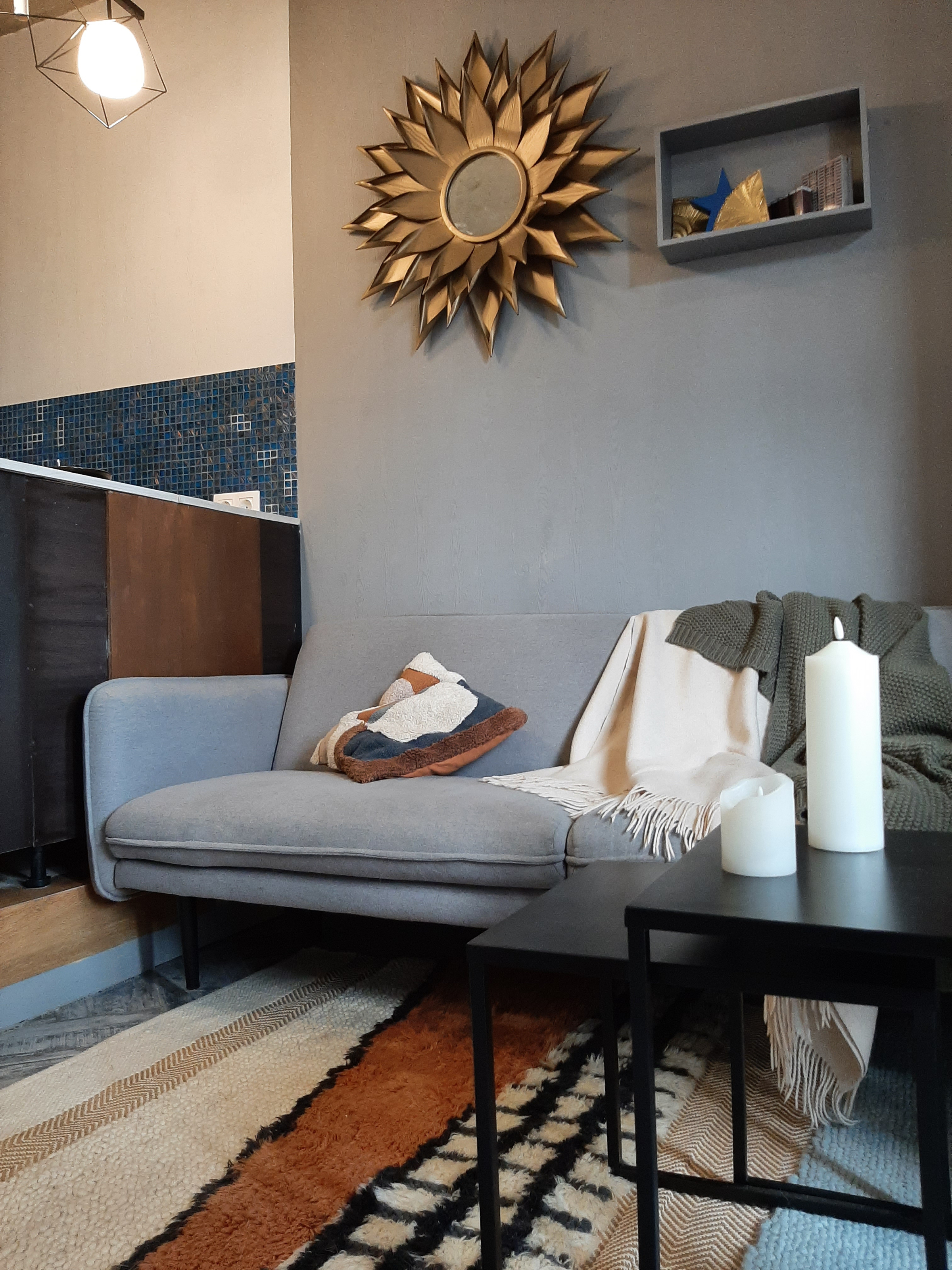 Для этой студии я подобрал качественную мебель, например диван-кровать Pillow, но нужно было его поддержать, поэтому Лена порекомендовала постелить ковер Kieran и добавила к дивану пледы и декоративные подушки.