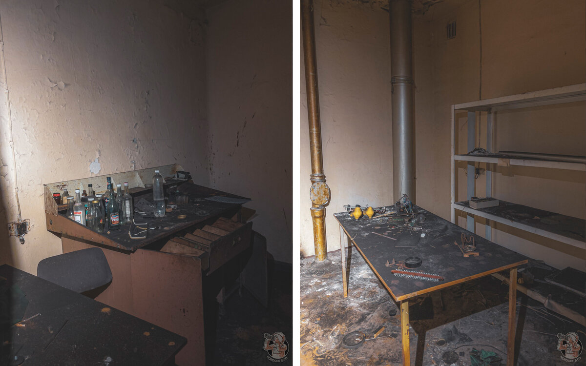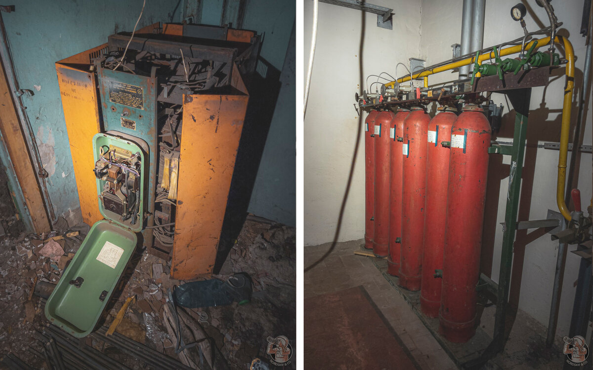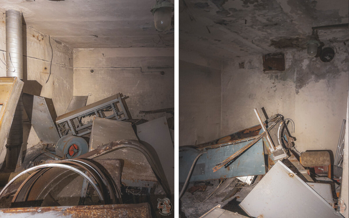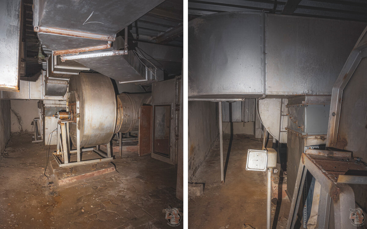 Из интересного стоит отметить остатки вентиляционной системы и системы очистки воздуха, а также электротехнические помещения на нижнем этаже бункера, куда изначально привела потерна.