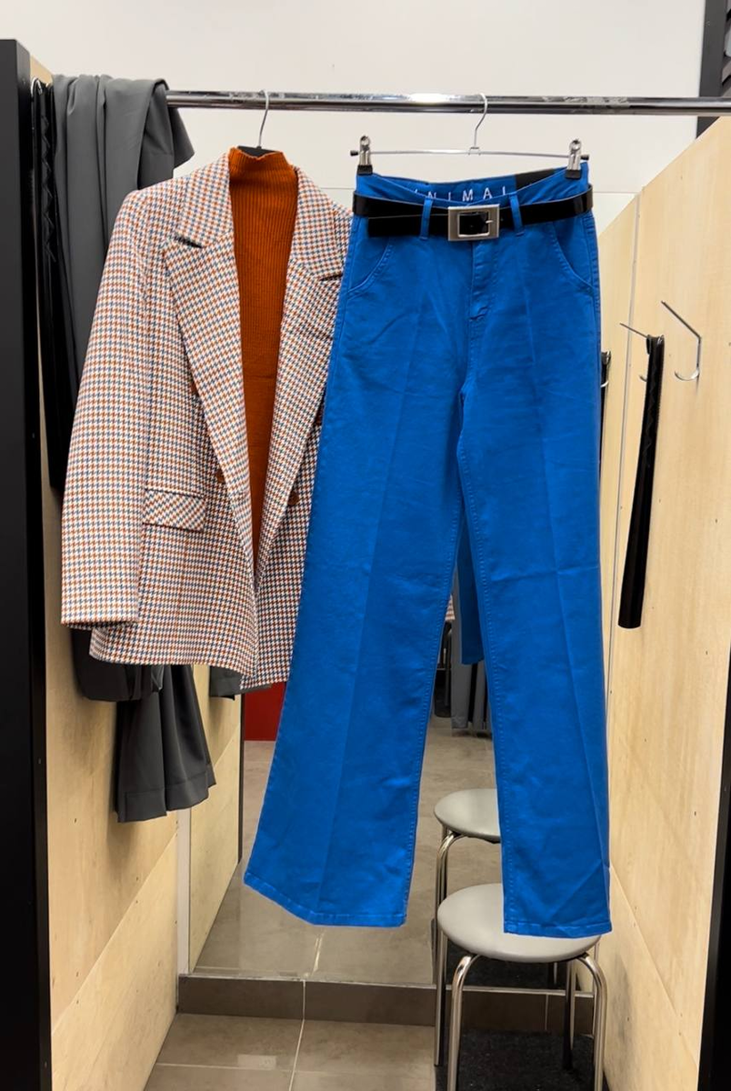 Можно поиграть с цветом и взять брюки в ярко-синем оттенке. Получится круто. Все вещи из 5КармаNов. Понравилось и качество, и фасоны.
