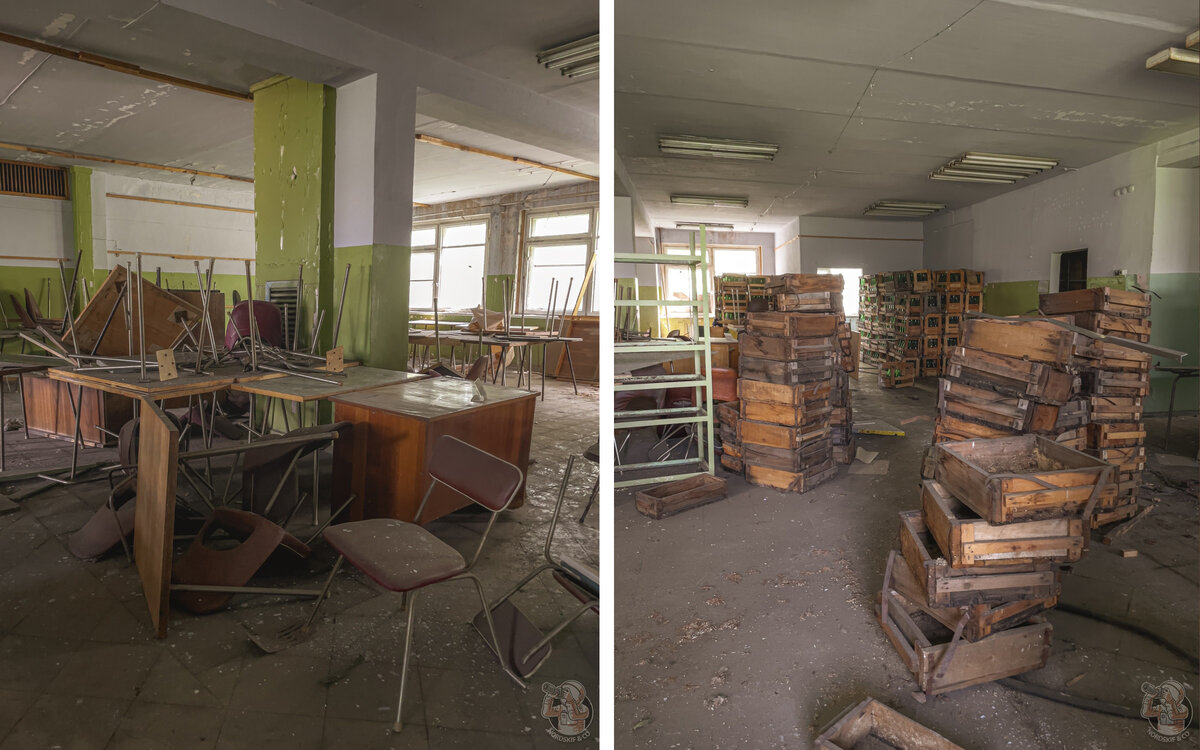 Тем не менее ещё недавно предприятие работало, а в столовой пахло не сыростью и строительным мусором, а вкусными заводскими обедами. Обеденный зал относительно скромных размеров, зато полностью сохранивший оригинальную меблировку. В большинстве заброшенных столовых нет ни столов, ни стульев. Интересно почему?