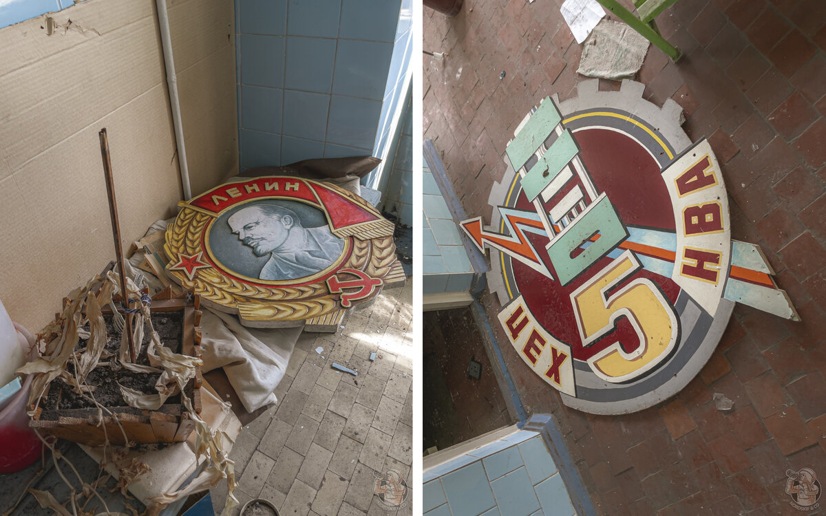 Отдельного внимания заслуживает большое количество коммунистической символики, ручной работы. Жалко, что всё может сгинуть под гусеницами трактора… Сейчас никто не заинтересован в спасении таких артефактов эпохи, считая их бесполезным пережитком.