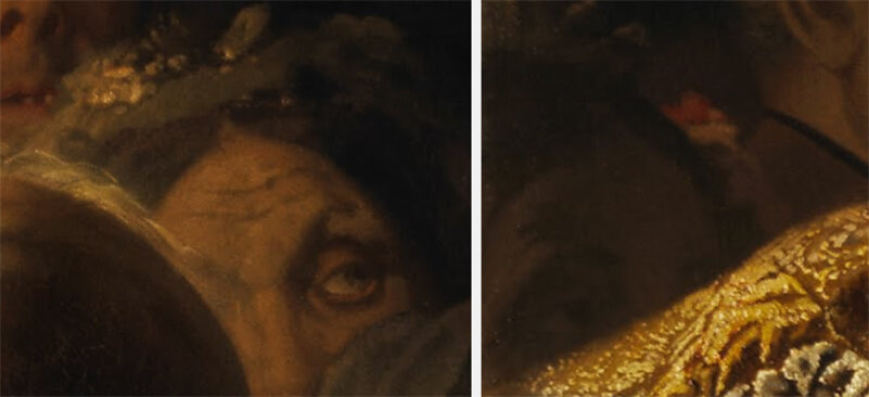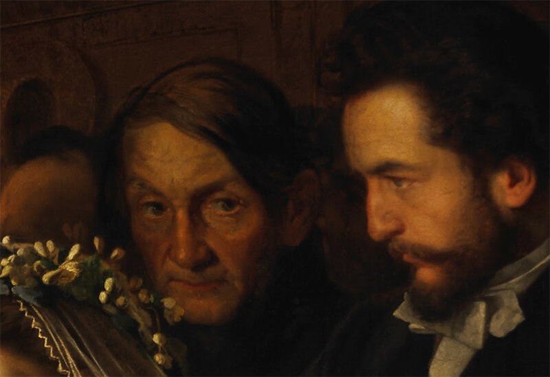 Одна из них стоит по правое плечо жениха. Она немолода, но облачена в подвенечный наряд — белое платье и венок. Другая — за священником и тоже в венке невесты. Женщины как будто укоряют взглядом зарвавшегося сластолюбивого старца.