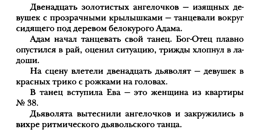 Сцена репетиции спектакля "Адам и Ева" театре более глубокая и яркая. А не просто, как в фильме, бегают по кругу несколько балерин. Описывается целое свето-музыкальное экспрессивное представление: