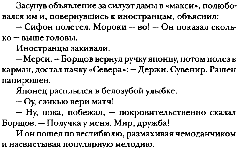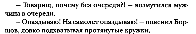 Борщов посмотрел на часы. На часах было пять минут четвертого. Переведя стрелки на час вперед, Борщов постучал в окошко. В нем снова появилось разъяренное лицо кассирши, показал ей свои часы.