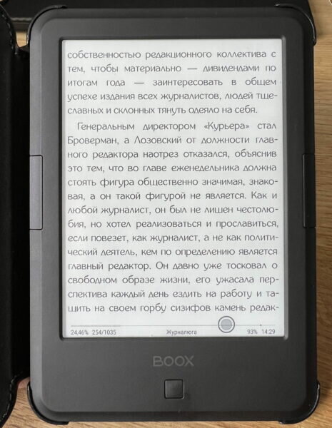 Я довольно регулярно рецензирую еще не вышедшие исторические издания. Они все, как на подбор, крупноформатные, и присылают их строго в PDF. Подустав от постоянного изменения масштаба туда-сюда, взял для этих задач ONYX BOOX Note 5. Экран там монохромный, но диагональ — целых 10.3 дюйма. С учетом разрешения 1872х1404 точки, книжная страница в полном размере выглядит как бы не лучше, чем на бумаге.