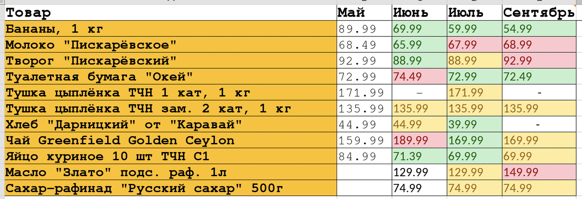 Результат "сентября" зафиксирован 8-го октября, цены я брала с сайта онлайн-доставки этой сети. Для удобства восприятия ячейки я выделяю цветами, отталкиваясь от прошлого показателя: