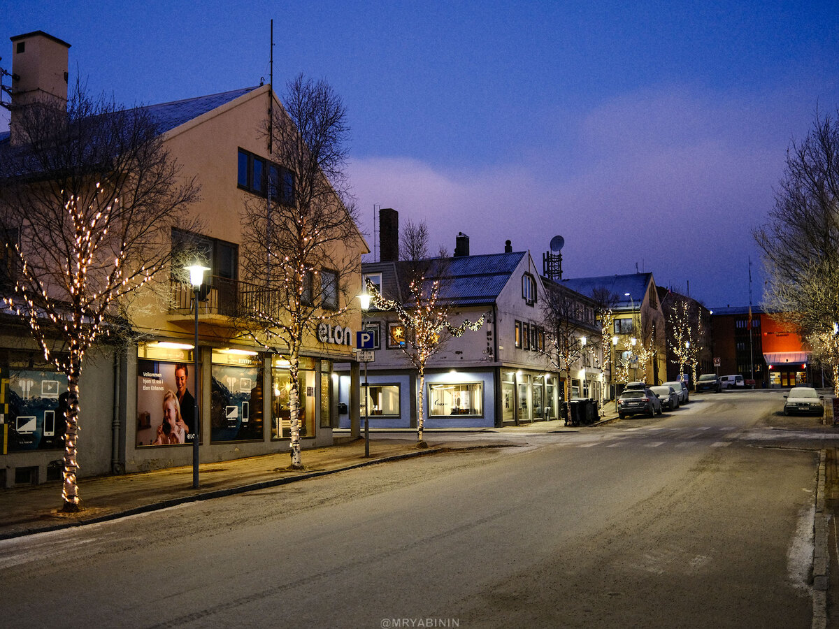 Во-вторых, в Норвегии любят подсвечивать улицы, дома и окна. Даже во многих офисах полярной ночью работает свет, будь то украшения или маленькие светильнички. Особенно это ощущается в частной зоне, где много частных домов и одноэтажных коммерческих зданий. Из-за этой традиции в сумраке полярной ночи приятно и тепло. Это я помню еще с моей поездки по Норвегии лет десять назад, когда наш ледокол заходил в несколько таких "сумеречных" городов Норвегии.