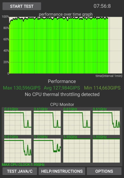А еще у Unisoc Tiger T616 в данном планшете есть колоссальный плюс: он не троттлится. То есть не сбрасывает частоту для борьбы с перегревом. К сожалению, многие (если не вообще все) флагманские чипсеты могут проработать с максимальной производительностью минуты три-четыре, после чего уподобляются середнячкам. А этот продержался 8 минут, и я просто уже выключил бенчмарк, потому что стала очевидной тщетность попыток.