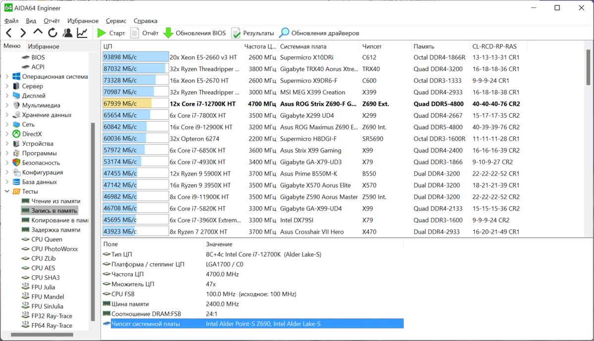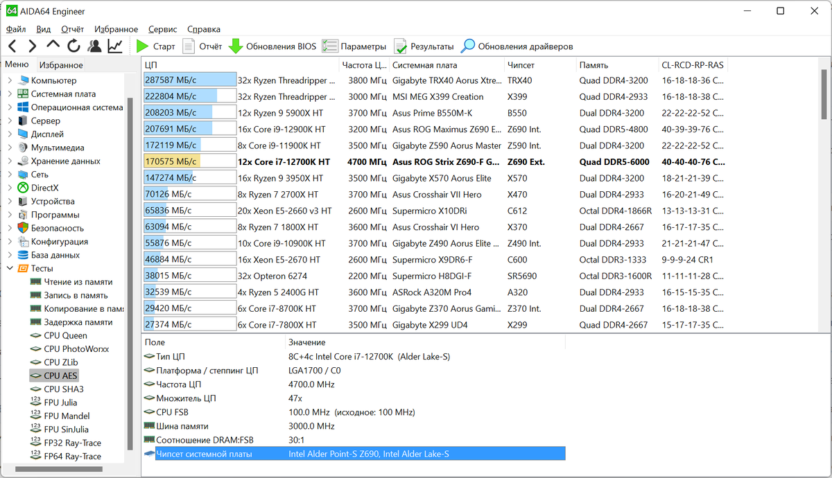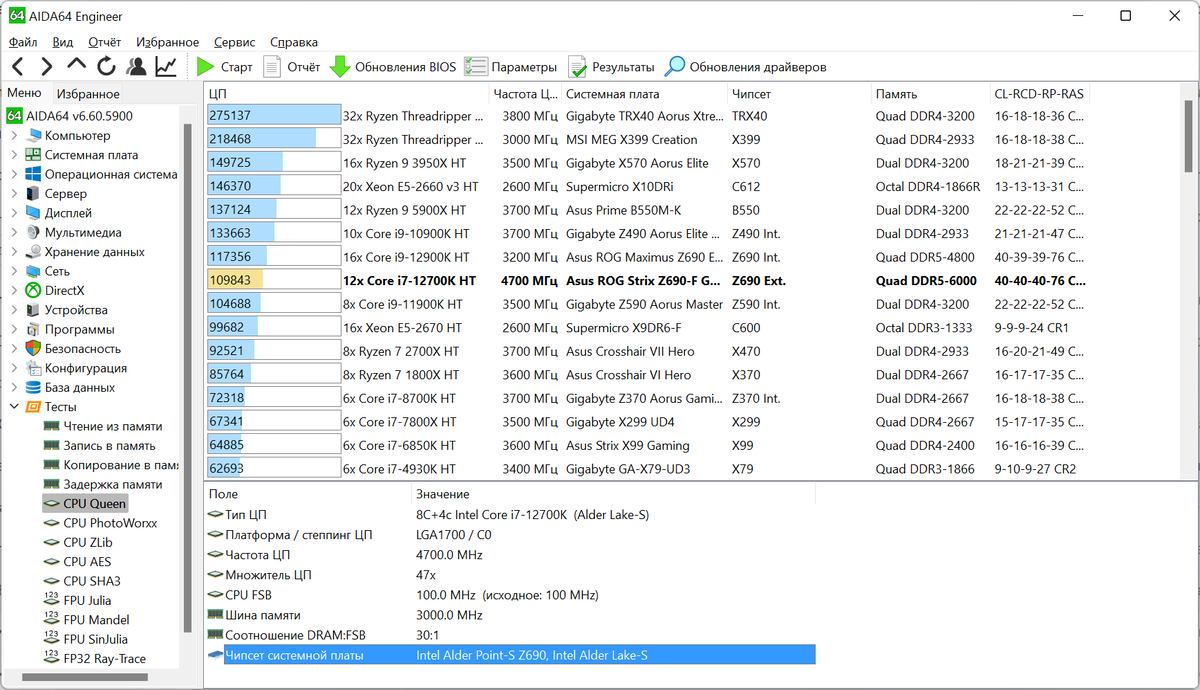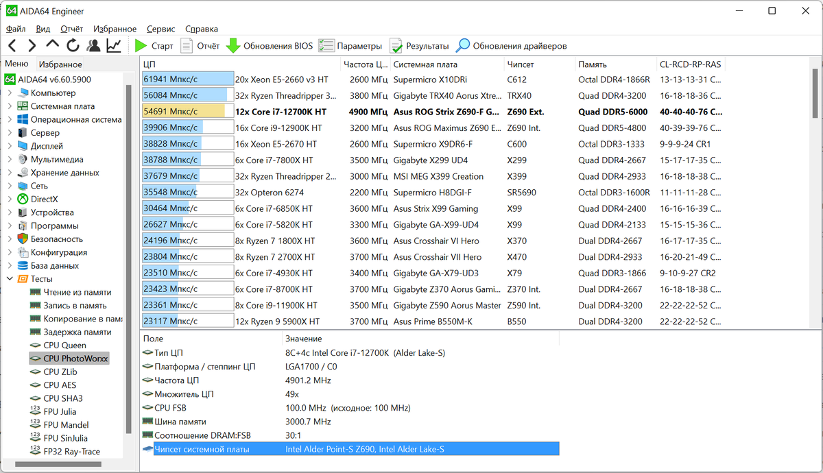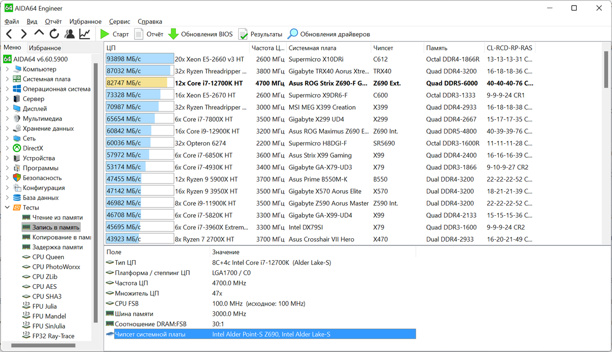 Для тестов использовался компьютер с Intel Core i7-12700K и материнской платой ASUS Rog Strix Z690-F Gaming Wi-Fi. Проверил работу на двух частотах: базовой 4800 МГц и с профилем XMP 6000 МГц. Сразу говорю, что почувствовать разницу «на глаз» не удалось, компьютер в обоих случаях работал совершенно одинаково. Но бенчмарки кое-что почувствовали.