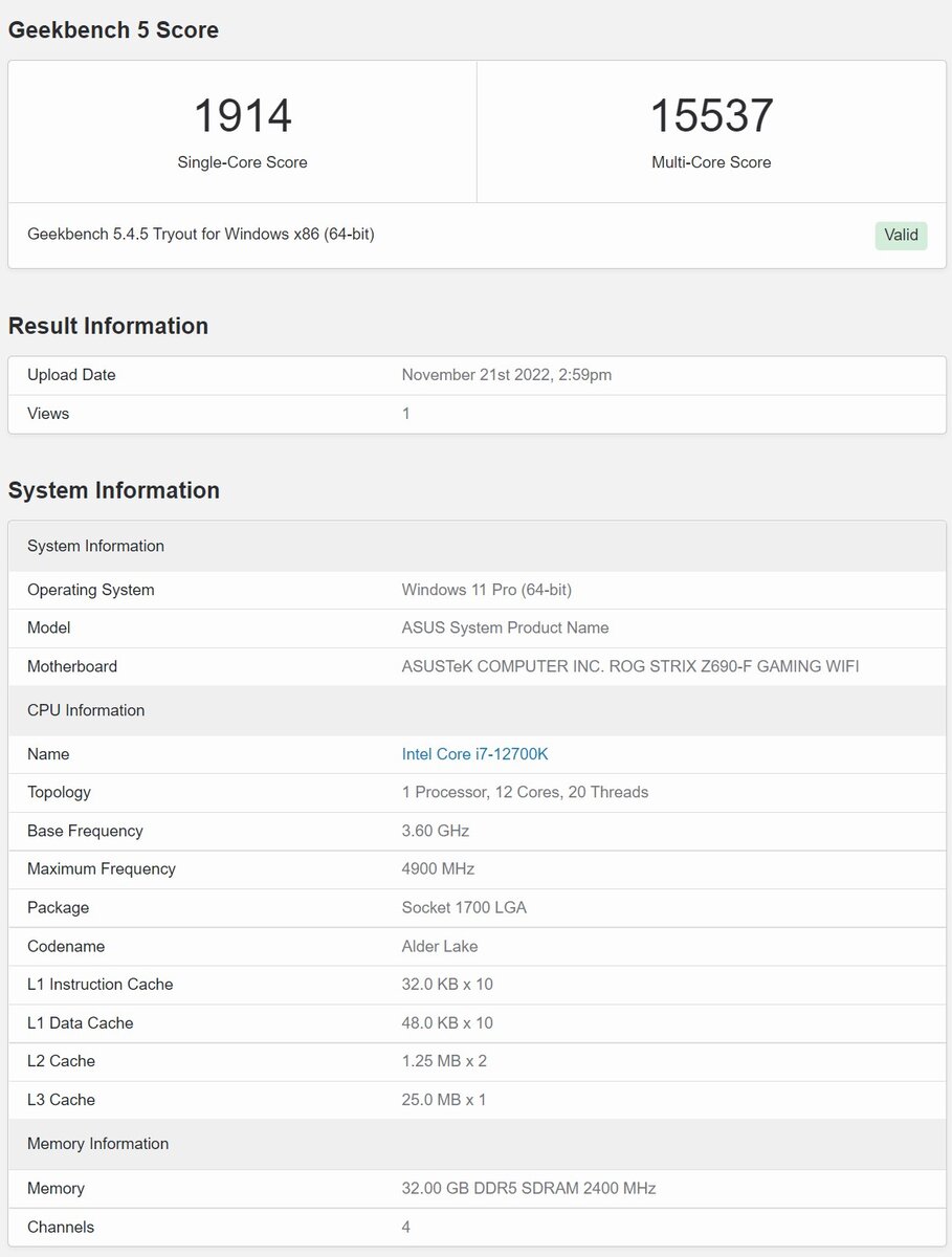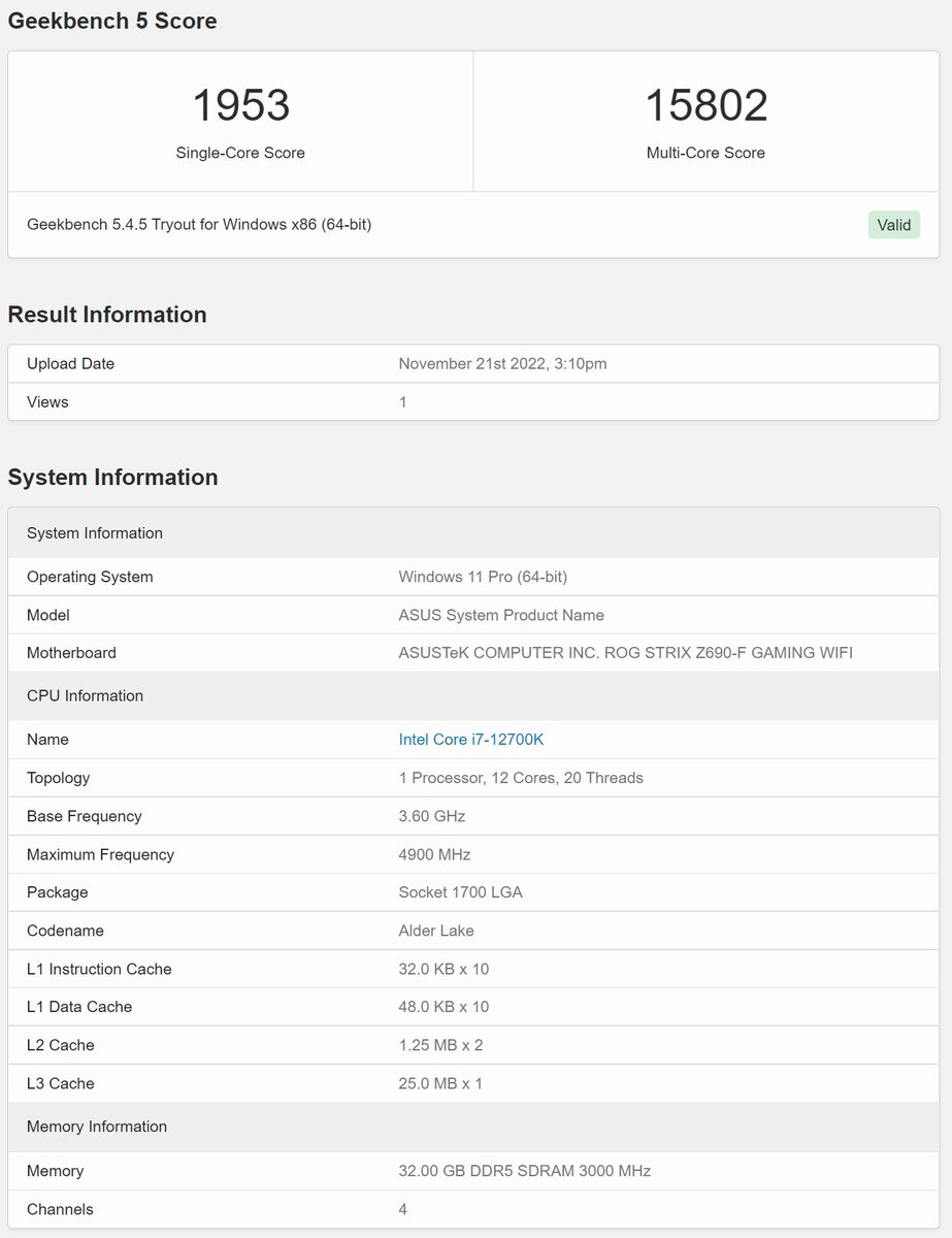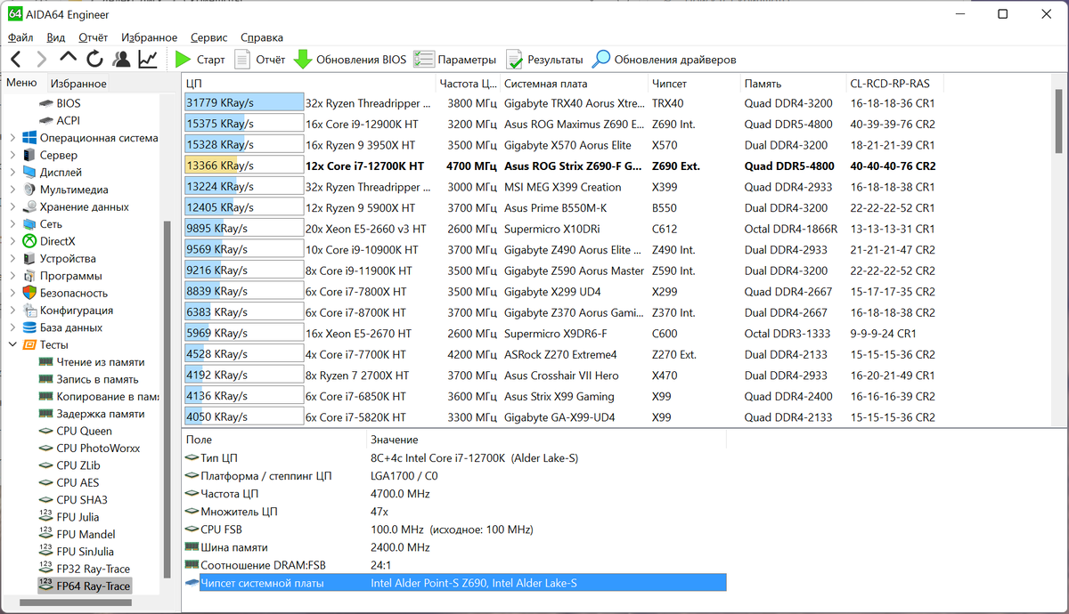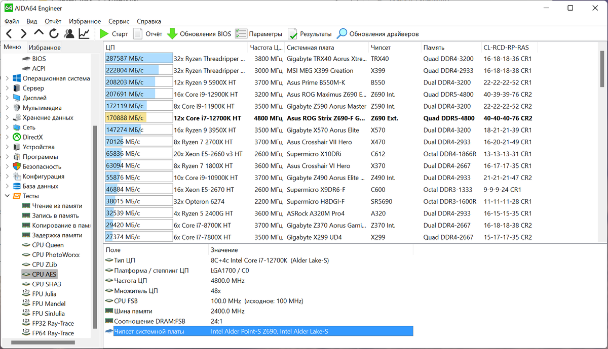 Для тестов использовался компьютер с Intel Core i7-12700K и материнской платой ASUS Rog Strix Z690-F Gaming Wi-Fi. Проверил работу на двух частотах: базовой 4800 МГц и с профилем XMP 6000 МГц. Сразу говорю, что почувствовать разницу «на глаз» не удалось, компьютер в обоих случаях работал совершенно одинаково. Но бенчмарки кое-что почувствовали.