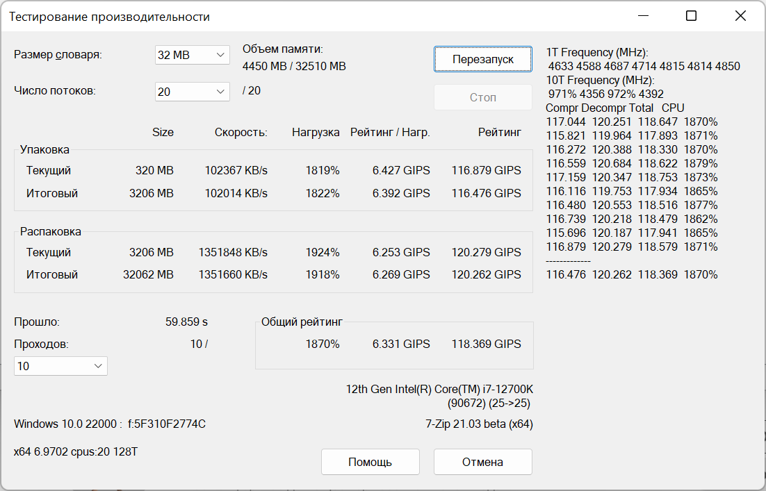 К счастью, бенчмарк, встроенный в 7-Zip, вселил некоторый оптимизм. Прирост частоты на 1200 МГц (на 25%) обеспечил результат на 8% выше.