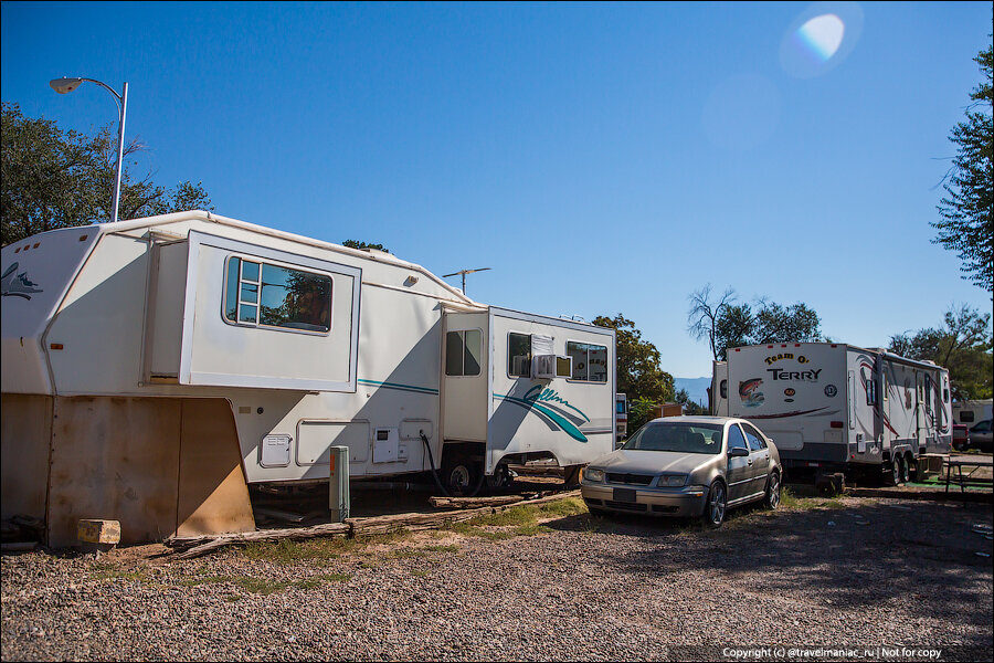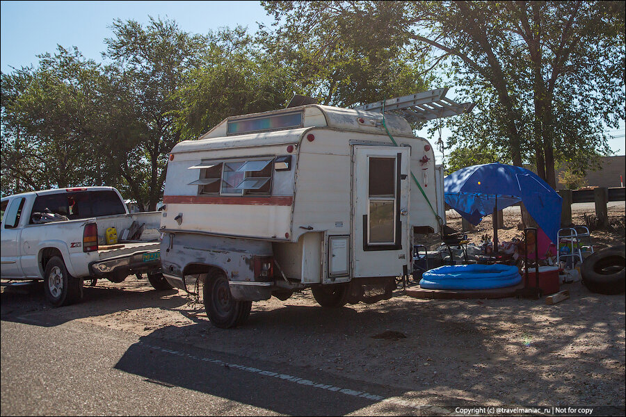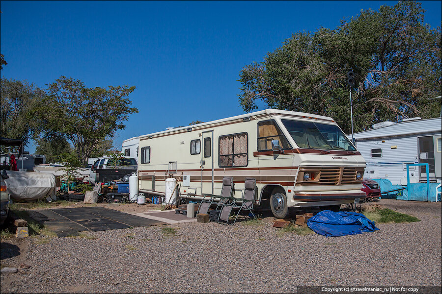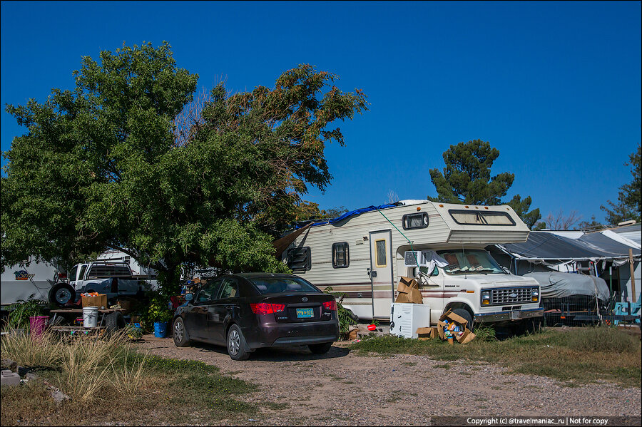 И живут они в старых домах на колёсах, как вы наверняка видели не раз и не два в голливудских фильмах. Зачастую это уже не те дома на колёсах, на которых люди путешествуют по всей стране, а ставшие на вечный прикол жилые кибитки. Способные, максимум, чтобы их перетаскивали из «города» в «город».
