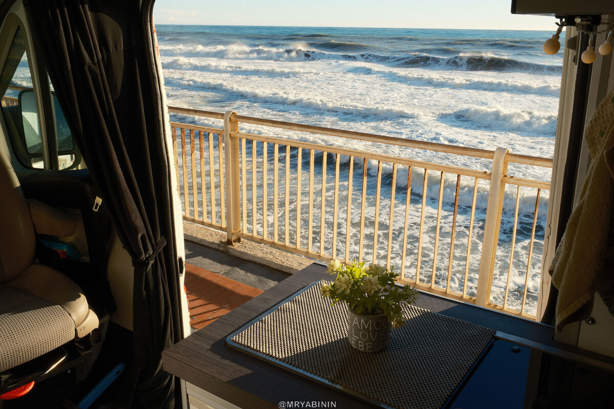 А теперь покажите мне такое место в городе у моря, где я могу подъехать на кемпере и встать на ночевку или поработать вот так… Не где-то там в горах, в лесу, на отшибе, в грязи, на бездоре, а на культурном месте, которое доступно и людям погулять, и на машине заехать, и на велике. Покажете? Сразу же его внесу в записную книжку…