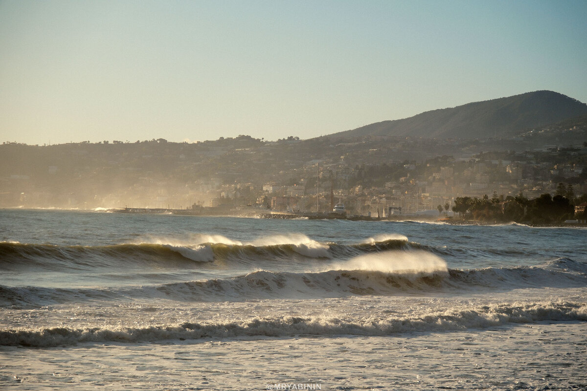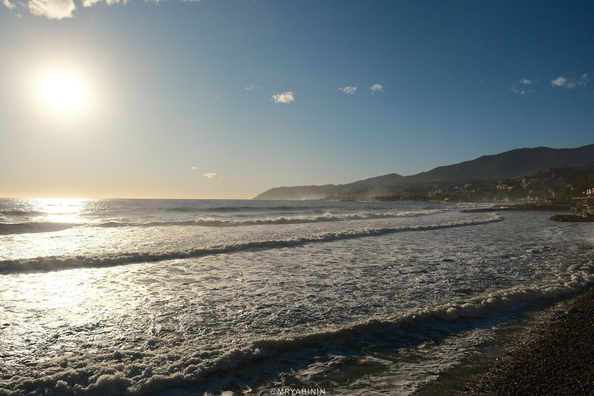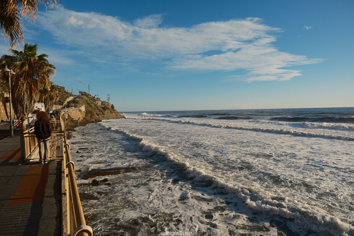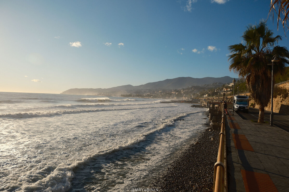 А вот, к примеру, побережье близ Сан-Ремо в Италии, куда я наконец перебрался из Франции. Тихая улочка, тупиковая, потому что основная дорога идет чуть выше. Пляжа нет, зато есть бесплатная парковка, есть тротуары и шикарный вид, на который просто хочется смотреть сутками.