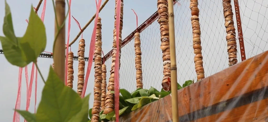 С бабочками борются, нанизывая скорлупу на нитки или тонкую проволоку. Нитки развешивают над грядками, проволоку втыкают непосредственно в землю. суть в том, что бабочки собираются в таких скорлупках и откладывают яйца. Их потом сжигают и развешивают новые скорлупки.