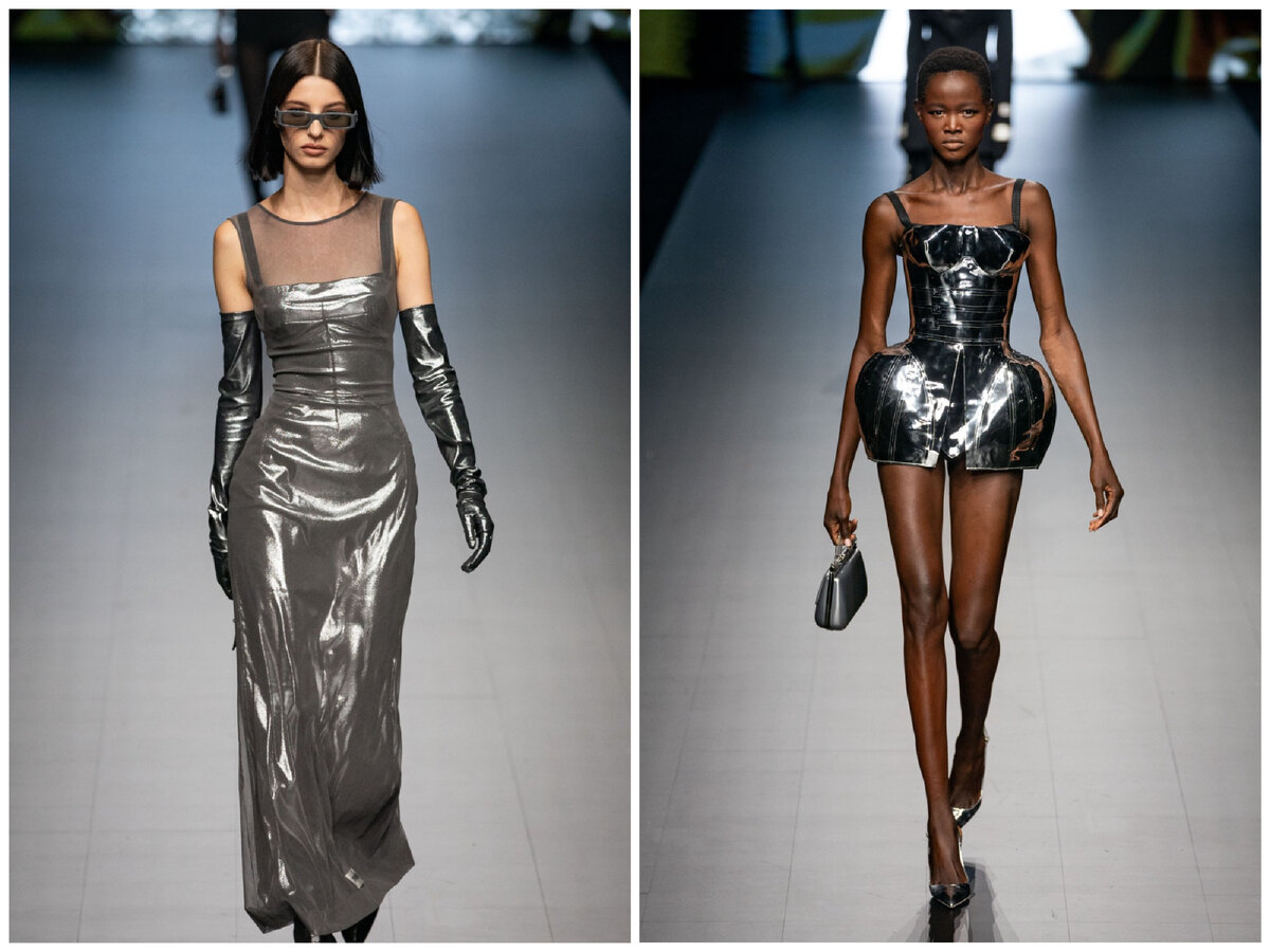 Носим металлизированную одежду как в тотал-луке, так и в комбинации с другими цветами. Серебряный металлик с черным — просто шедеврально!