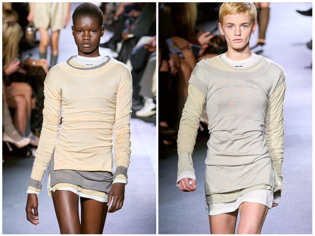 Помните, я не раз говорила, что сейчас модно не что, а как. Дизайнеры показывают нам, как носить привычные вещи чуть иначе. Например, используя многослойность. Вся фишка — чтобы слои было видно. Из-под пятницы суббота, сказали бы наши бабушки. Сверху можно увидеть, как Miu Miu играют с абсолютно привычными вещами, которые есть у многих из нас.