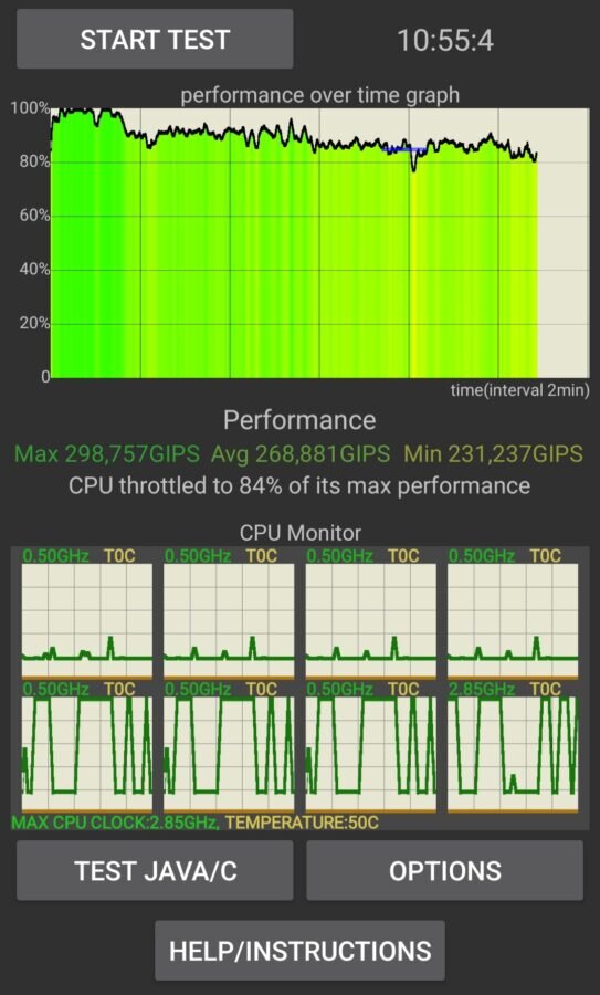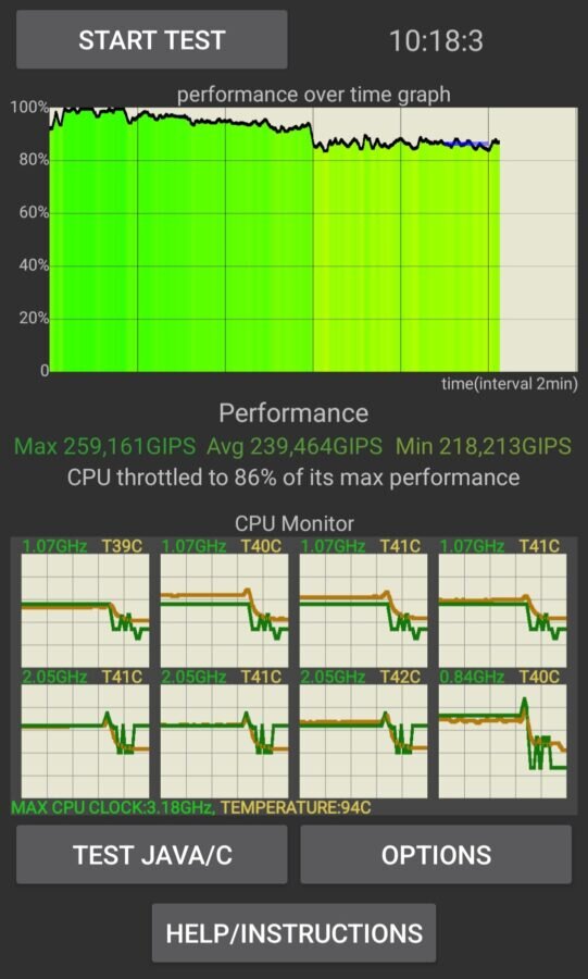 Такую бы скорость да без троттлинга, но чудес не бывает. После двух минут на максималках Dimensity снизил частоту до 84%, и потом работал на ней до конца теста. У Snapdragon 870 процесс снижения производительности более плавный, и дно он нащупывает примерно к шестой минуте. Но тут надо понимать, что Dimensity 8100 в троттлинге в среднем быстрее, чем Snapdragon 870 на максимальной производительности. Поэтому переход на SoC Mediatek однозначно оправдан.