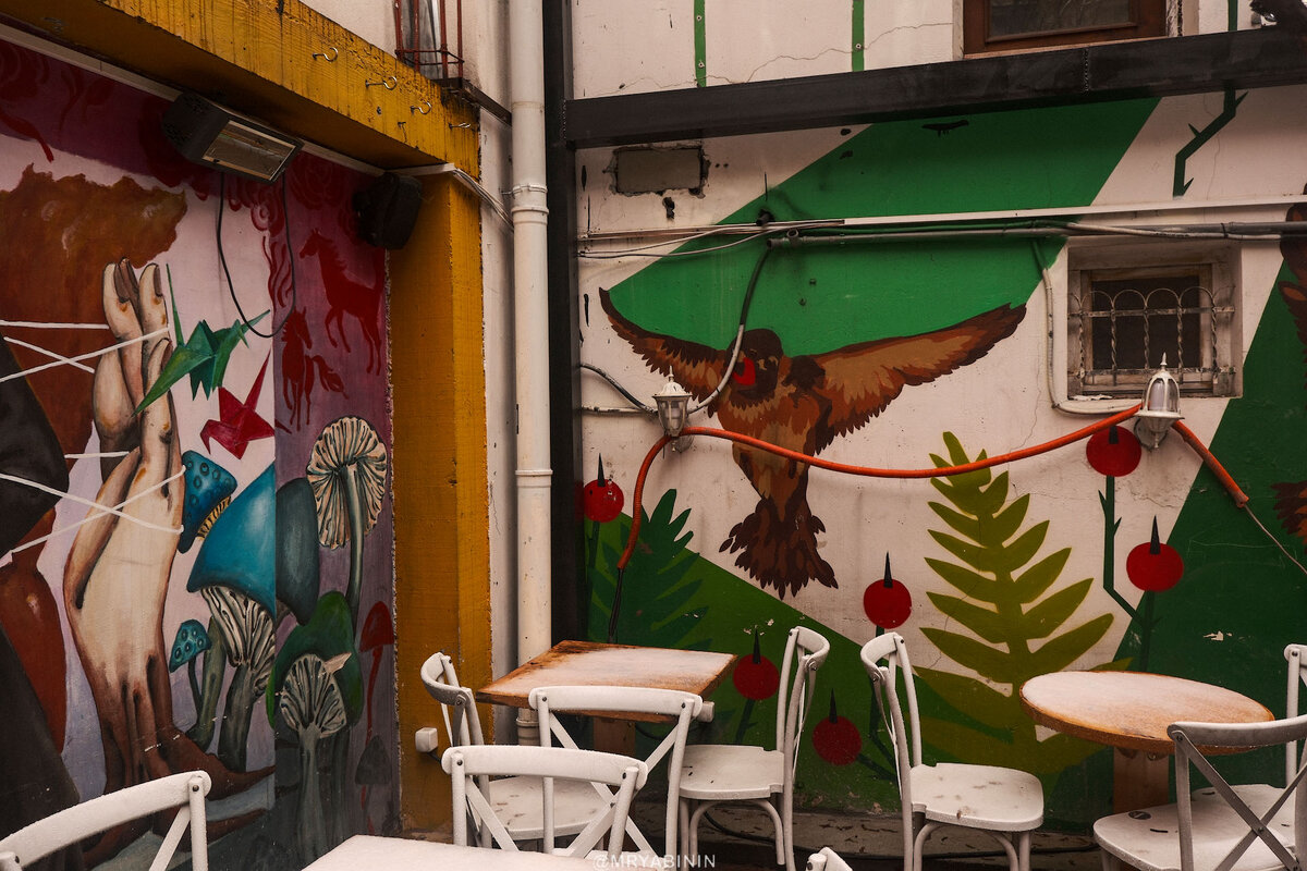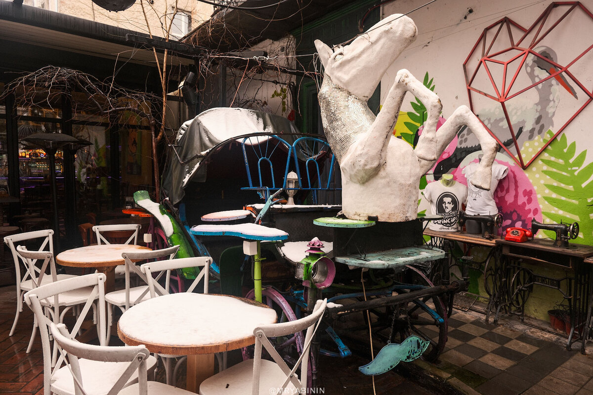 Началось все с уличных инсталляций, который оказались уличными столиками. Судя по количеству посадочных мест — этот бар довольно культовое место у местных неформалов или просто любителей легкого сумасбродства. Почему бы не выпить коктейль, сидя компанией прямо на тротуаре, вокруг импровизированного стола из чего-то похожего на мотоцикл или с частями от него!?
