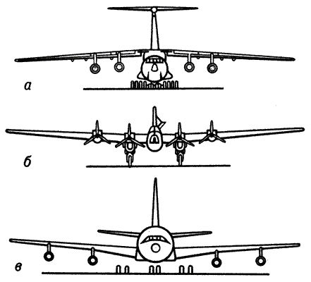 Высокопланы (а) имеют крыло над фюзеляжем. Например, у «Руслана» Ан-124 или у Ан-148.
