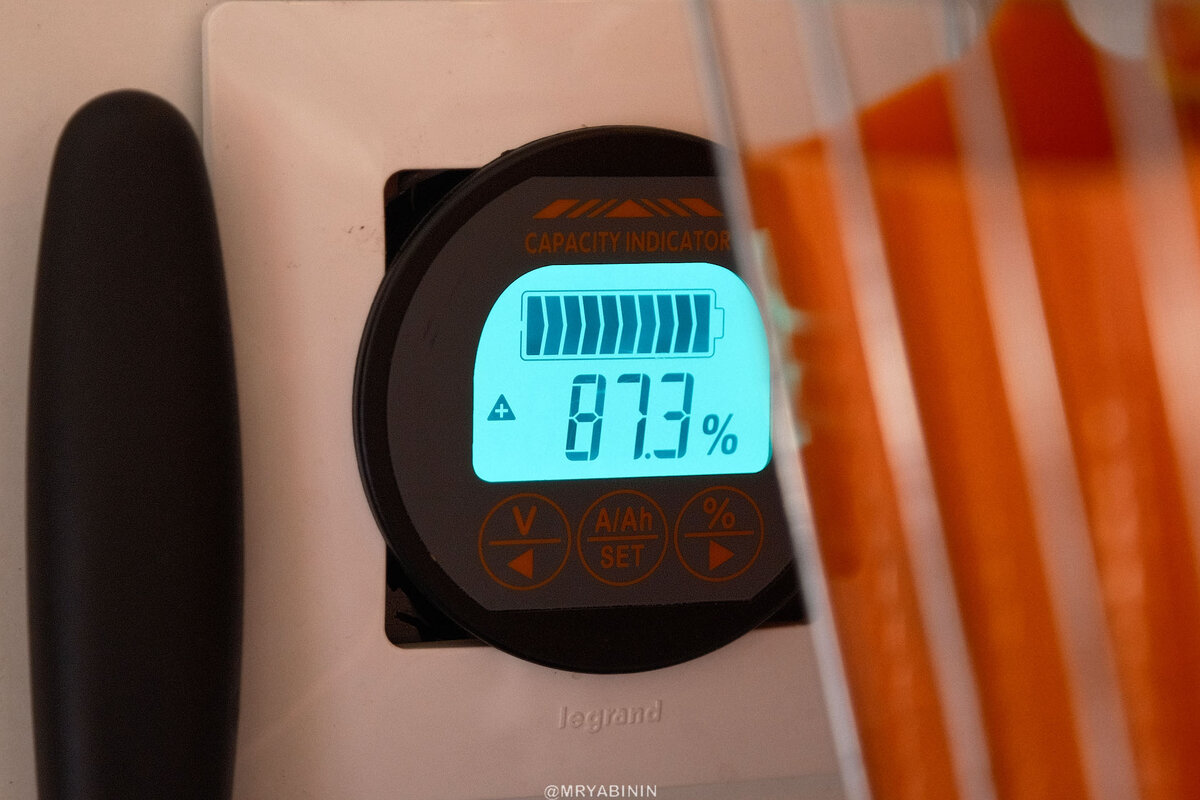 За ночь работы автономного отопителя Ebespaecher 2KW, холодильника, света, зарядок для телефонов и мощного ноутбука, бортовой гелевый аккумулятор на 150Ah уронил заряд до 80 с копейками процентов. За два часа, пока был завтрак и купание в источниках, заряд АКБ вырос до 87%. К концу короткого "солнечного дня", которого есть в запасе еще около 4 часов, заряд будет полностью восполнен.