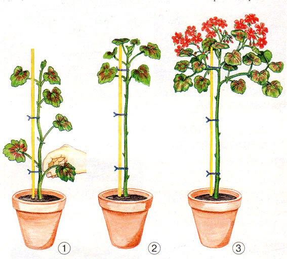 Чтобы штамб был ровным, вставляем в грунт ближе к стволику длинную опору (палку) и привязываем к ней растение по всей длине ствола. Ленту, которой подвязывается герань, нельзя туго затягивать, дабы не нанести вред растению.