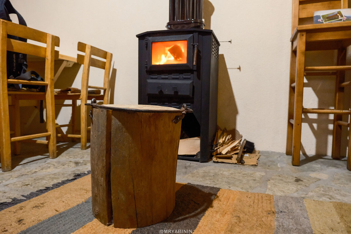 На улице прохладно. В помещении общей столовой гостевого дома горит печь, рядом с которой импровизированный табурет из пенька с металлической ручкой. Это же надо было додуматься!?