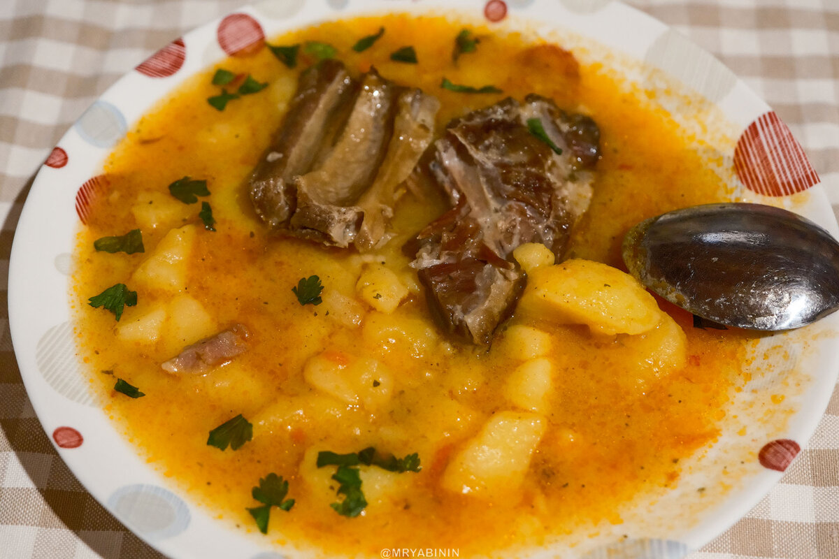 Несмотря на то, что оплачен один домик для Алексея и его семьи, кормят национальным блюдом всех приехавших. Похлебка с копченостями очень вкусная. На тарелке не остается ничего.