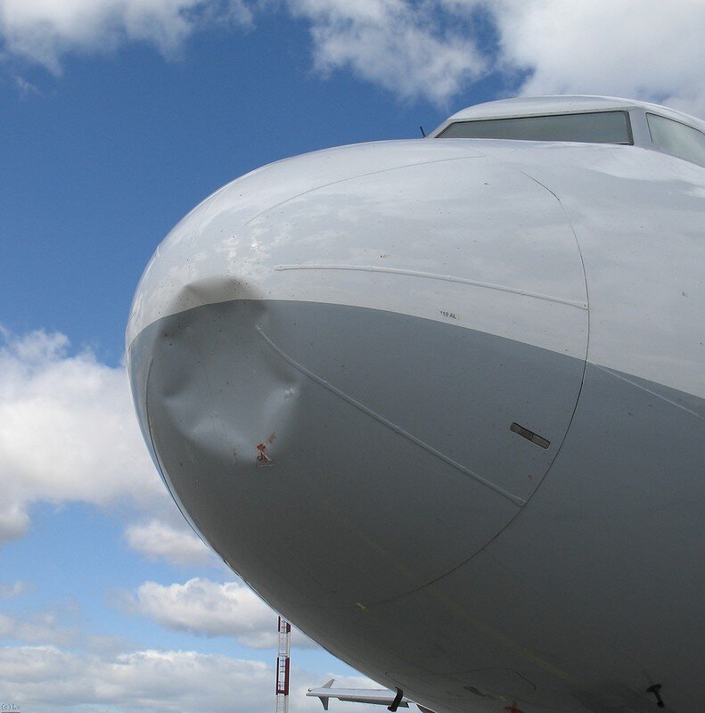 Лобовые же стёкла у самолётов толстые и прочные, так что обычно даже не трескаются. Хотя иногда крупные птицы и способны нанести заметные повреждения, как на фото ниже.