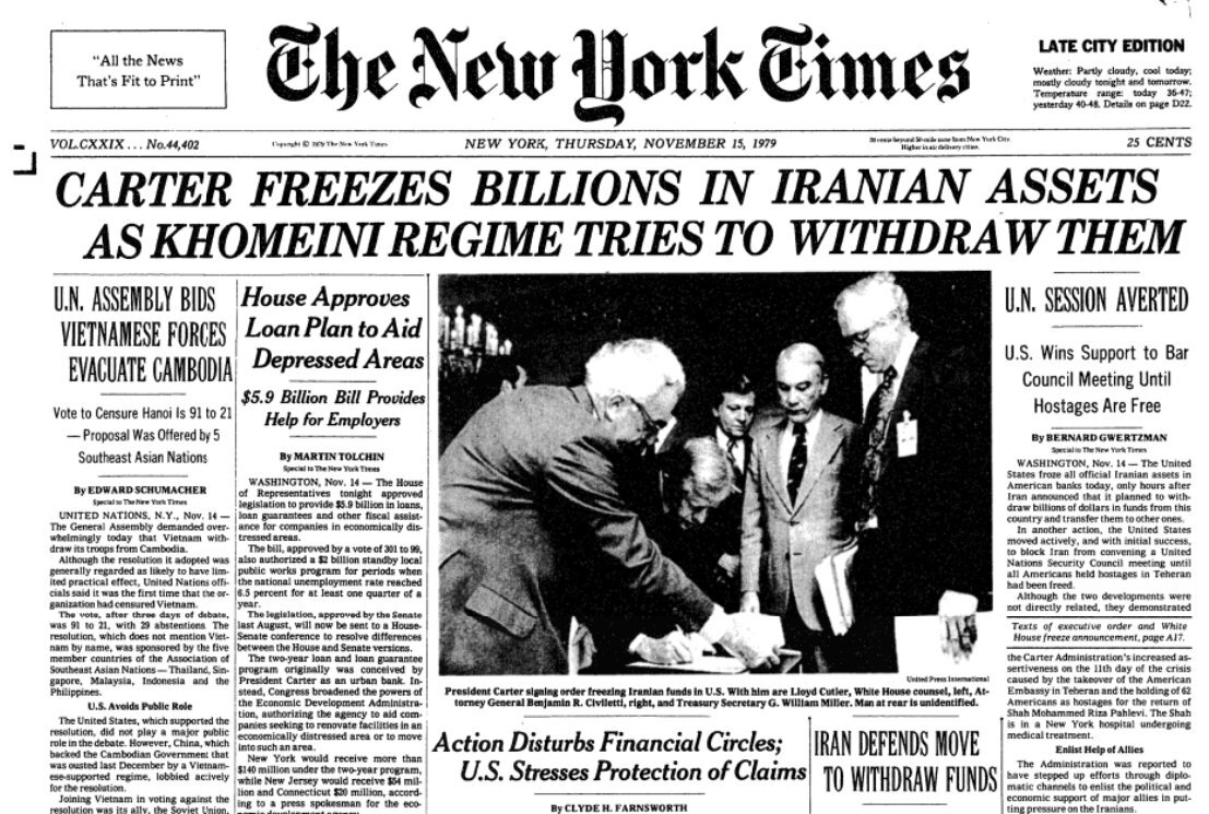 Именно это событие считается отправной точкой для длящихся уже более 40 лет антииранских санкций: спустя 9 дней администрация президента Джима Картера объявила о заморозке закупки иранской нефти, заморозки иранских вкладов и счетов в американских банках, а также запретила продавать в Иран широкую номенклатуру технической продукции военного и двойного назначения.