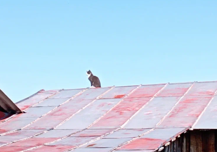 Этот кот еще только готовится стать гордым орлом. А сейчас он сидит на крыше сарайки и радуется солнцу и теплому дню.