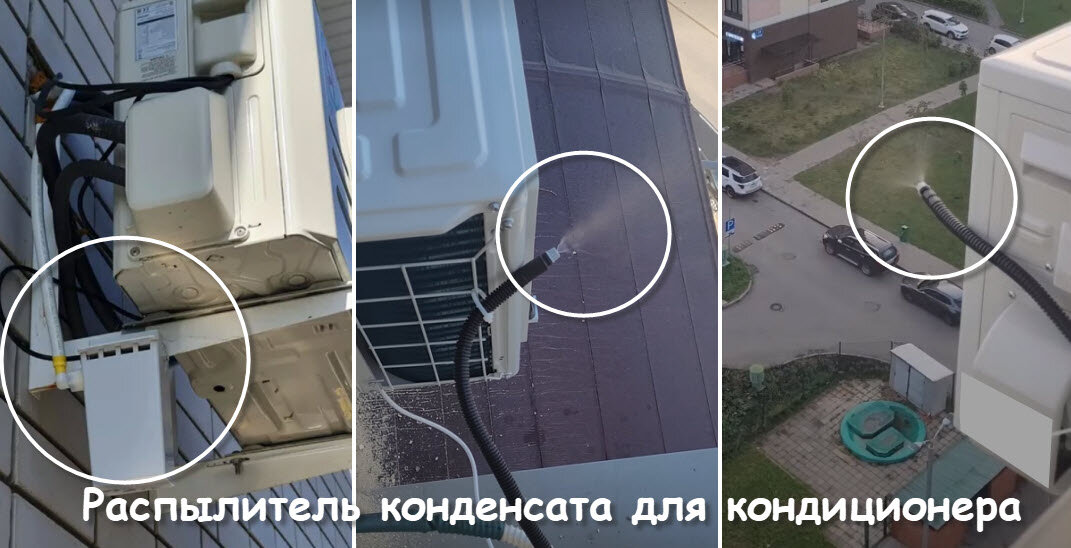 Появилось приспособление не так давно. Называется распылитель конденсата. Больше не нужно беспокоиться, что капли падают вниз на людей или отмостку, соседские окна, отлив, фасад здания, разрушая его.