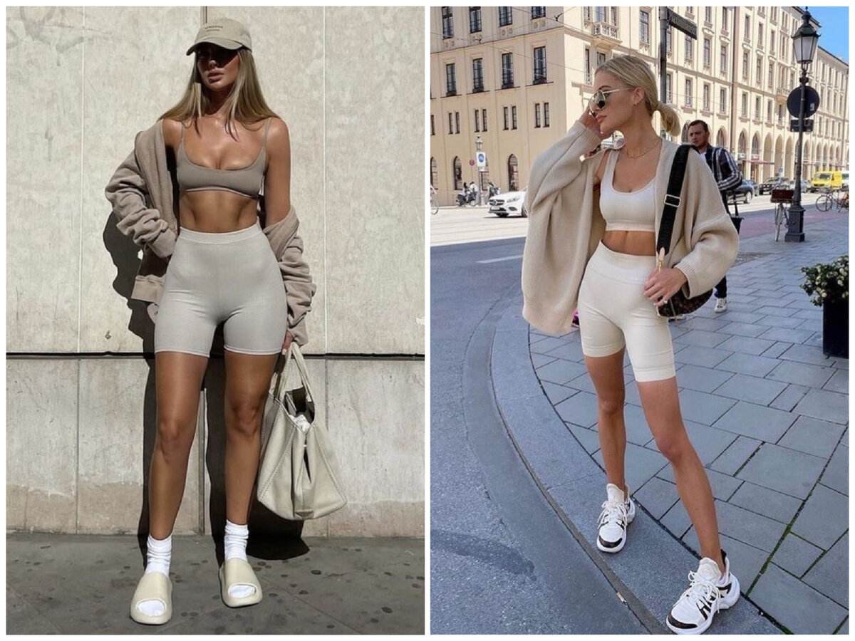 В 2023 году леггинсы и велосипедки носят по-разному. Одни с верхом, который всё прикрывает, другие — с кроп длиной.