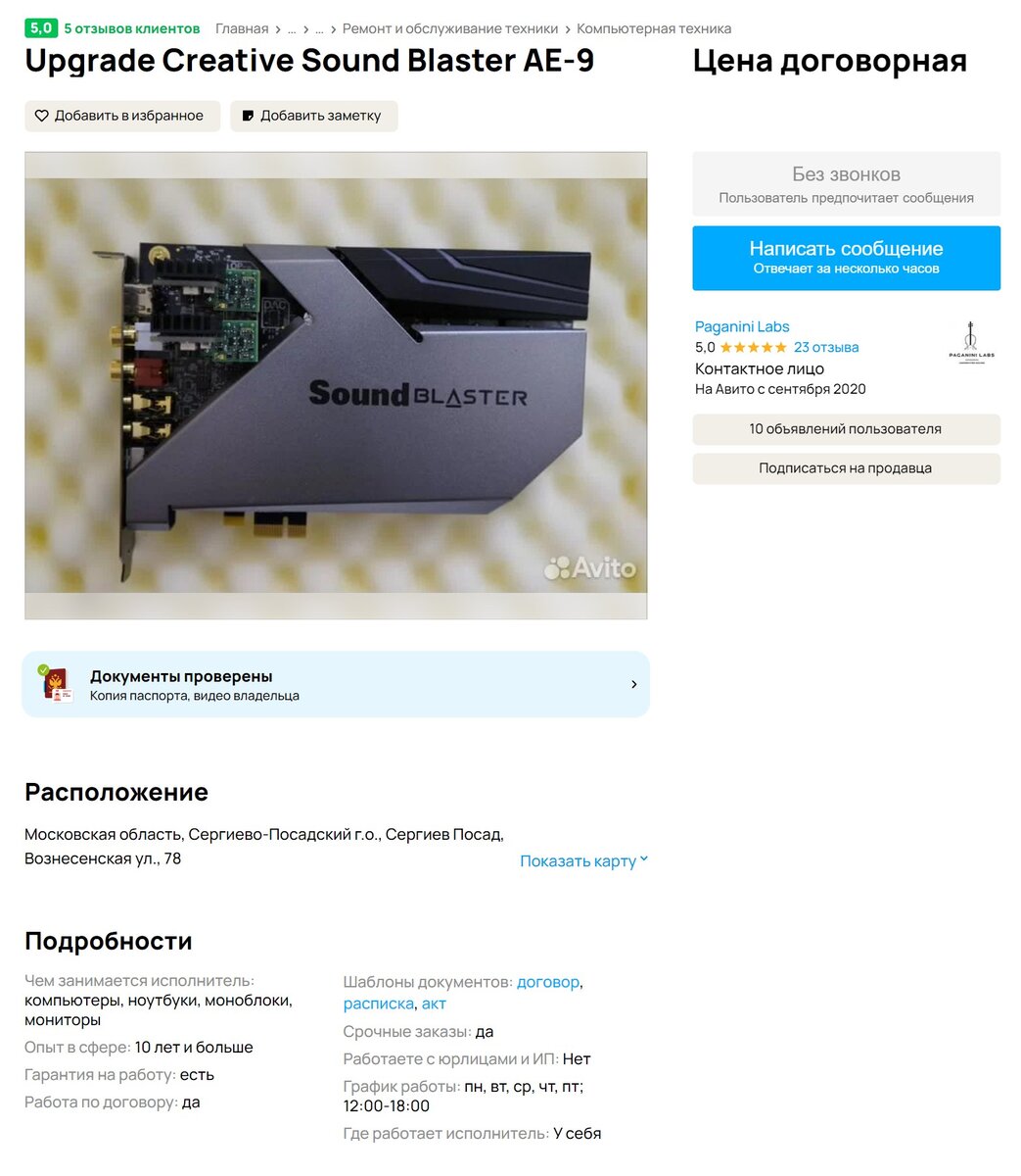 Мы договорились о встрече для передачи обновленной карты, и в процессе немного расспросил Сергея о том, как он решил разместить объявление об апгрейде звуковых карт на Авито. Наш мастер по профессии архитектор информационных систем, магистр делового администрирования и инженер-электрик. У него два любимых хобби – хороший звук и шахматы. Однажды друг попросил улучшить его карту, и, под впечатлением от результата, посоветовал опубликовать объявление, чтобы магия стала доступна и другим людям. Судя по комментариям под объявлением, услугой воспользовались минимум шесть человек, включая меня. Относительно небольшое количество клиентов не должно смущать. Во-первых, это не основная работа Сергея, и задача рубануть побольше денег не стоит. Это, в первую очередь, удовольствие. Во-вторых, модернизации подлежат не только карты Creative, но и много чего другого в мире качественного аудио. Так что Paganini Labs (так называется проект Сергея) на отсутствие загрузки не жалуется.