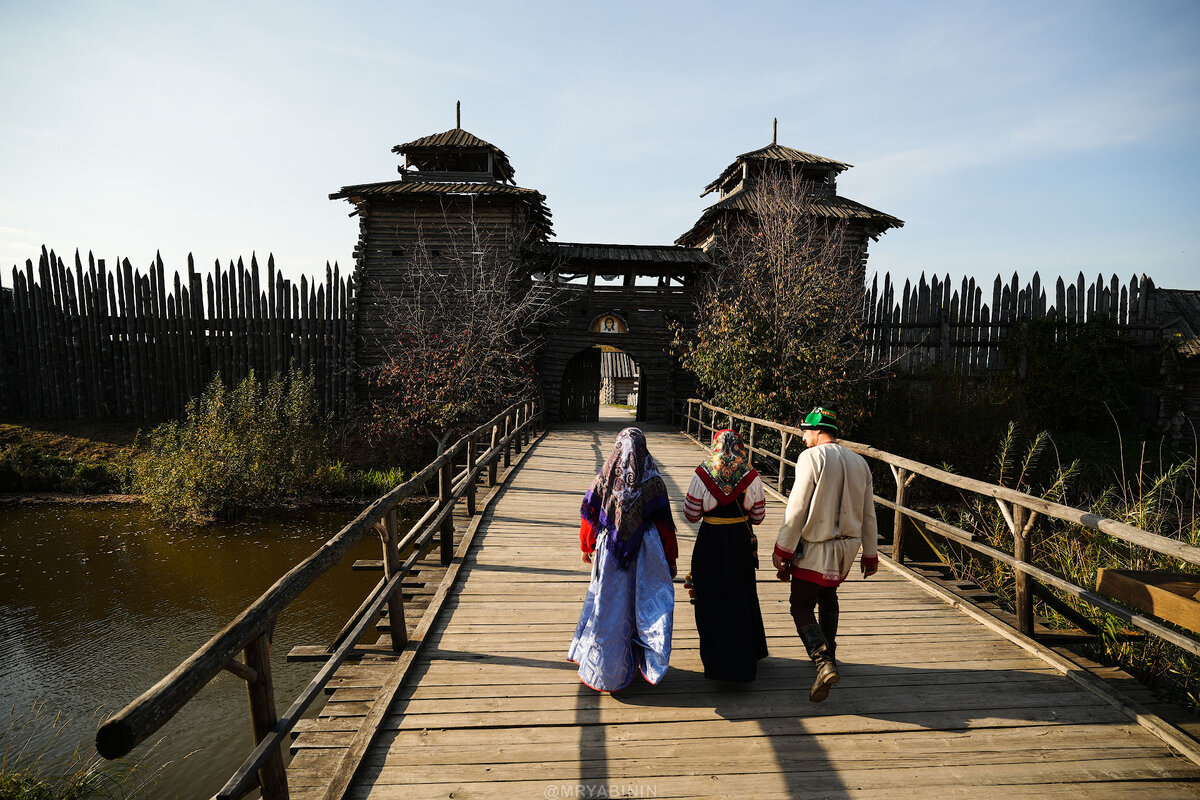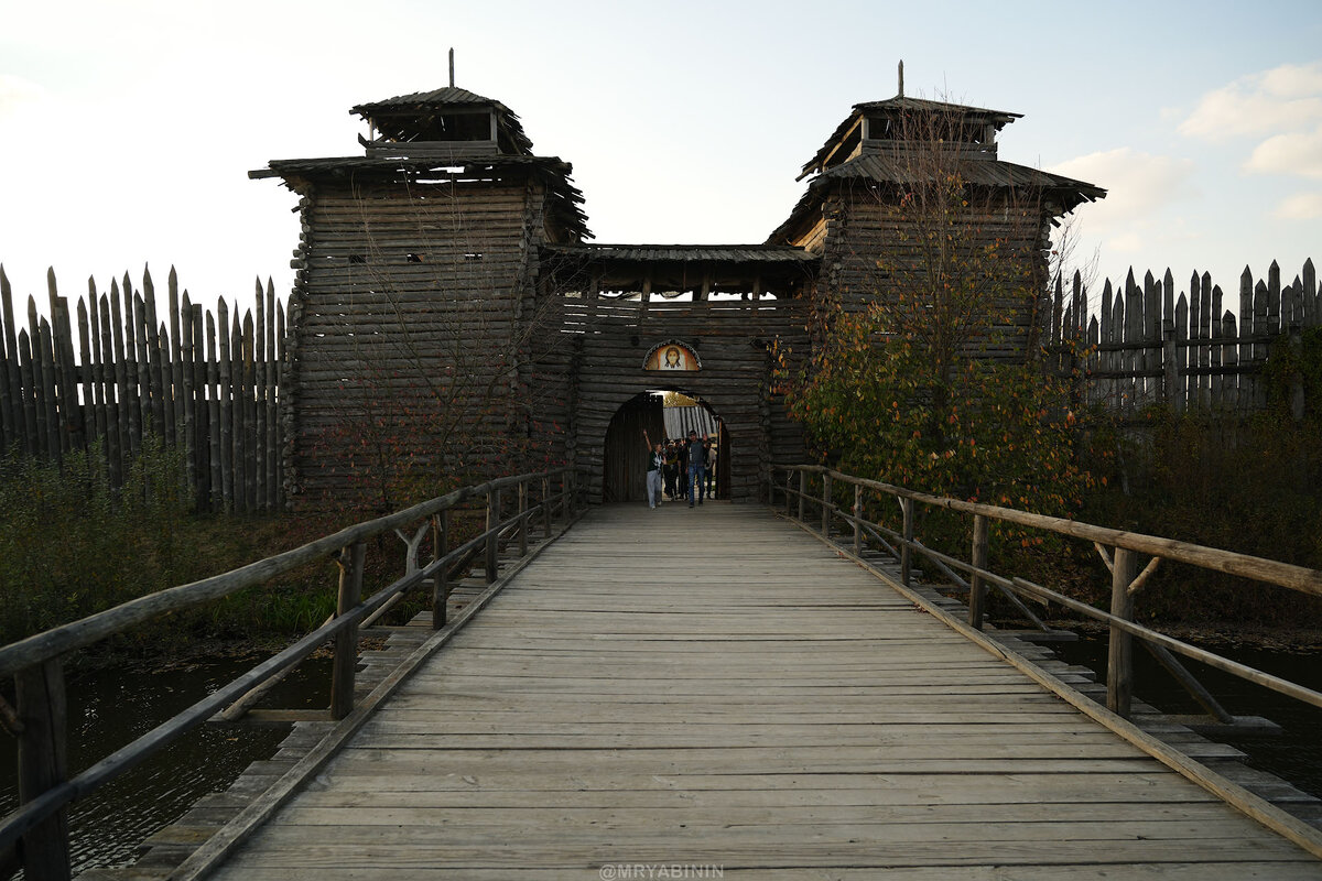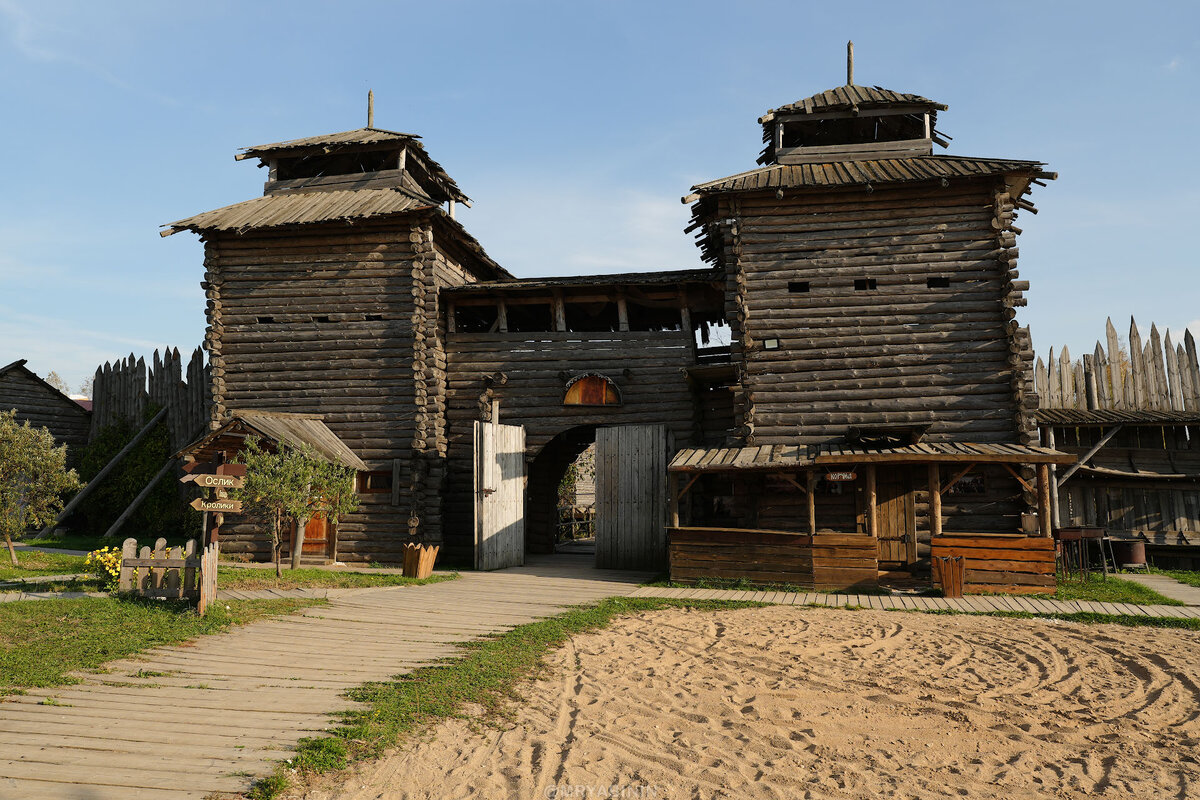 В Щурово Городище попадаешь через массивные ворота с башнями. На одних даже висит табличка с надписью "Корчма", но остальные здания не очень похожи на действующие, за исключением тира, где можно покидать топоры или пострелять из лука.