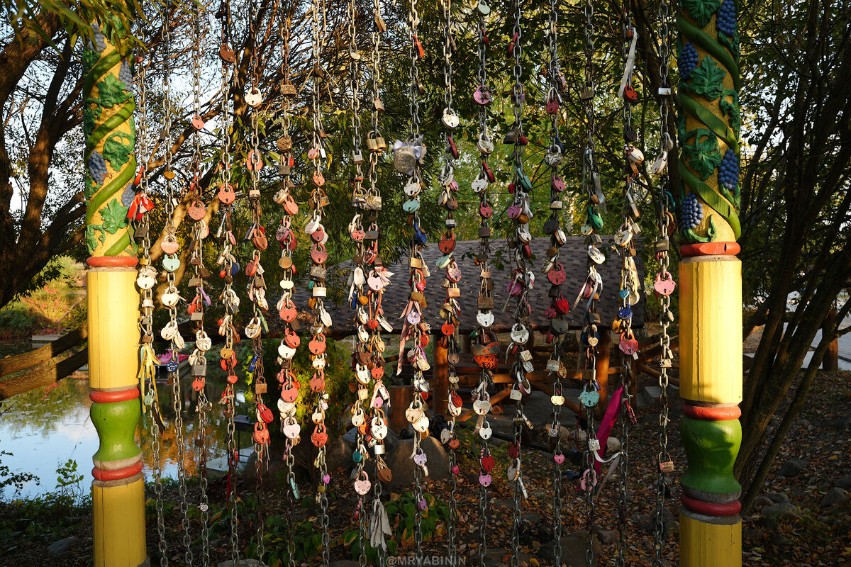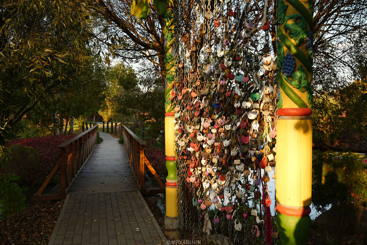 Судя по этой композиции у мостика через речку на территории комплекса "Горячие Ключи", тут проводят свадьбы или периодически появляются молодожены. Ну кому придет в голову еще вешать замочки!?