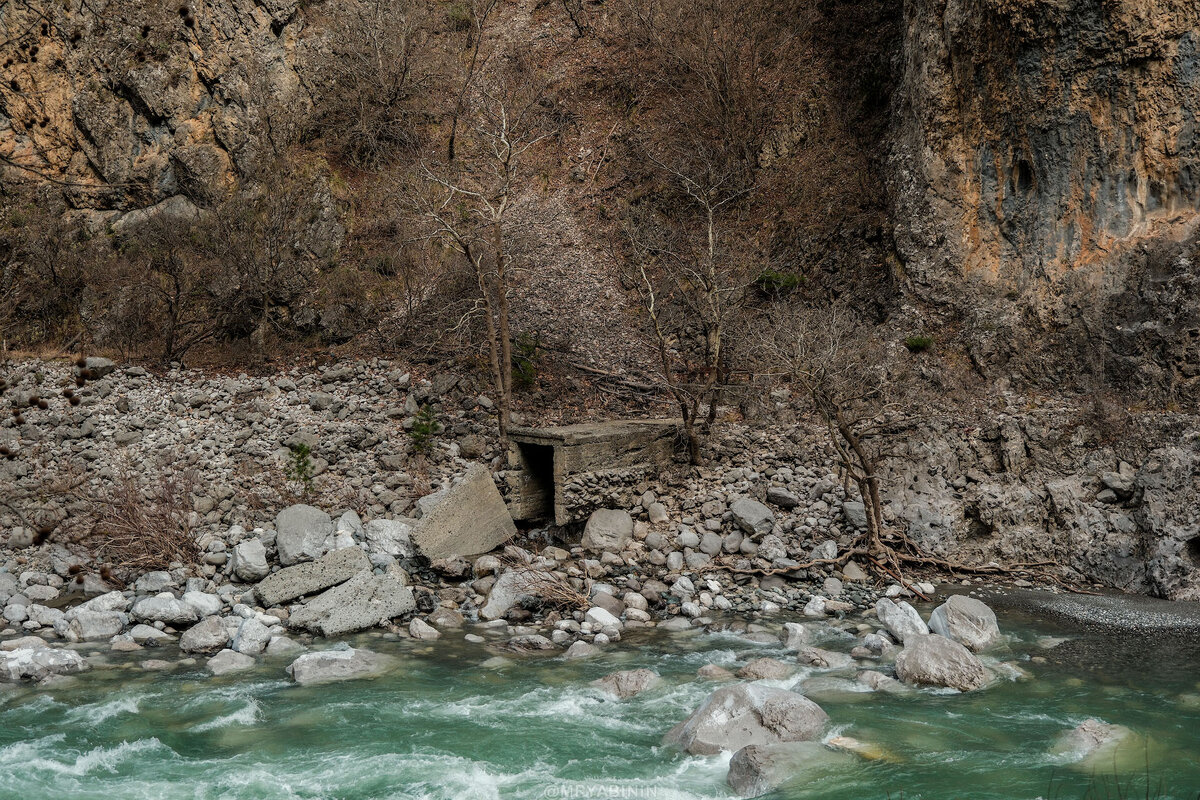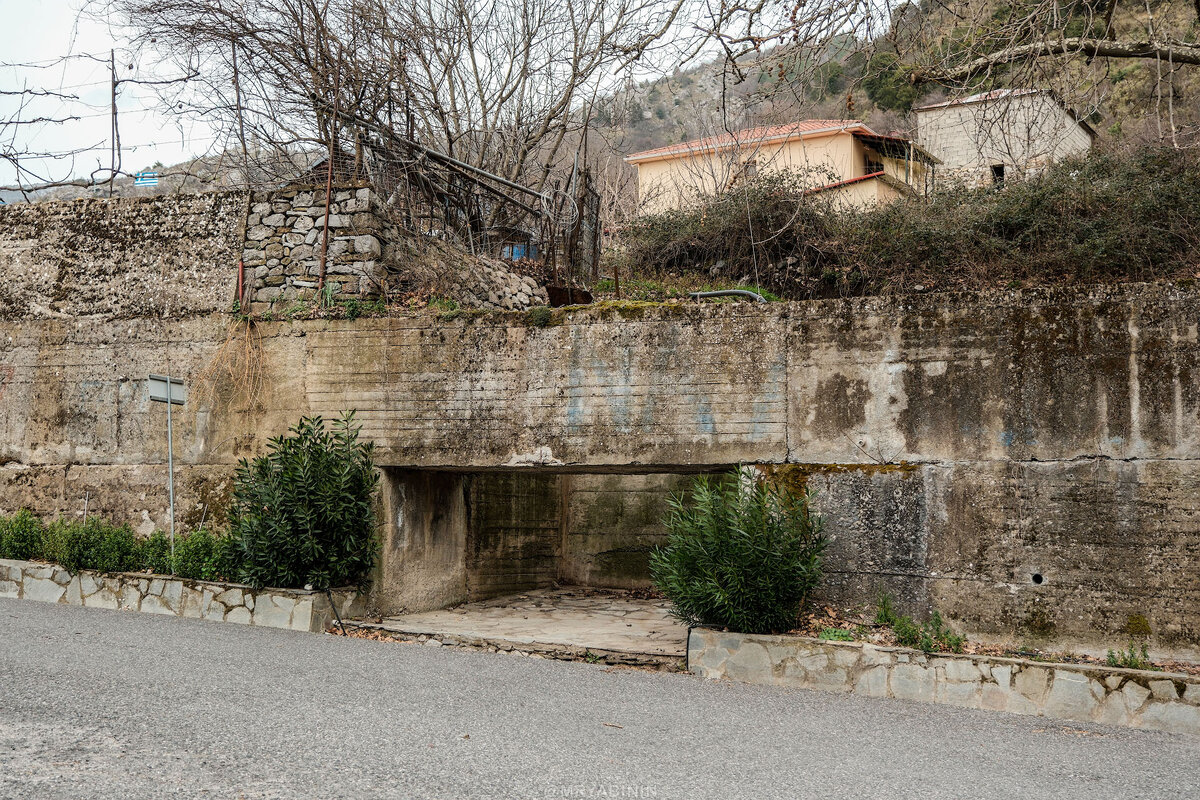 За ДОТом начинается сам городок, в который и уходит этот старый бетонный водопровод прямо из горной реки.
