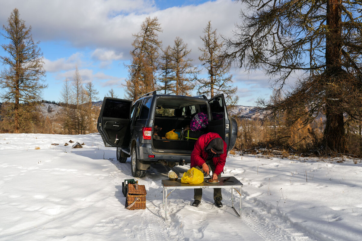 Заехали в Манжерок, посмотреть на новый горнолыжный курорт, который очень понравился, а по дороге к Кумиру остановились на вершине перевала, чтобы в красивом месте перекусить. Пока Хасан накрывал стол, я бросился снимать окрестную природу в свете выглянувшего солнца.