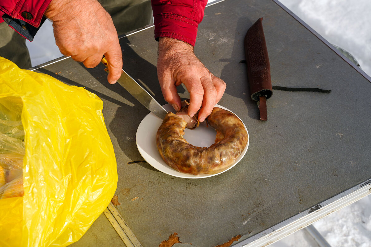 Основным блюдом перекуса в пути стала казахская колбаса Казы. Хасан еще в прошлый раз пытался найти, где купить ее, чтобы угостить нас, и в этот раз он заранее позаботился. Колбаса оказалась невероятно вкусной и сытной. Хасан рассказал, что готовили ее прямо при нем и что она соответствет оригиналу, который он ел в Казахстане.